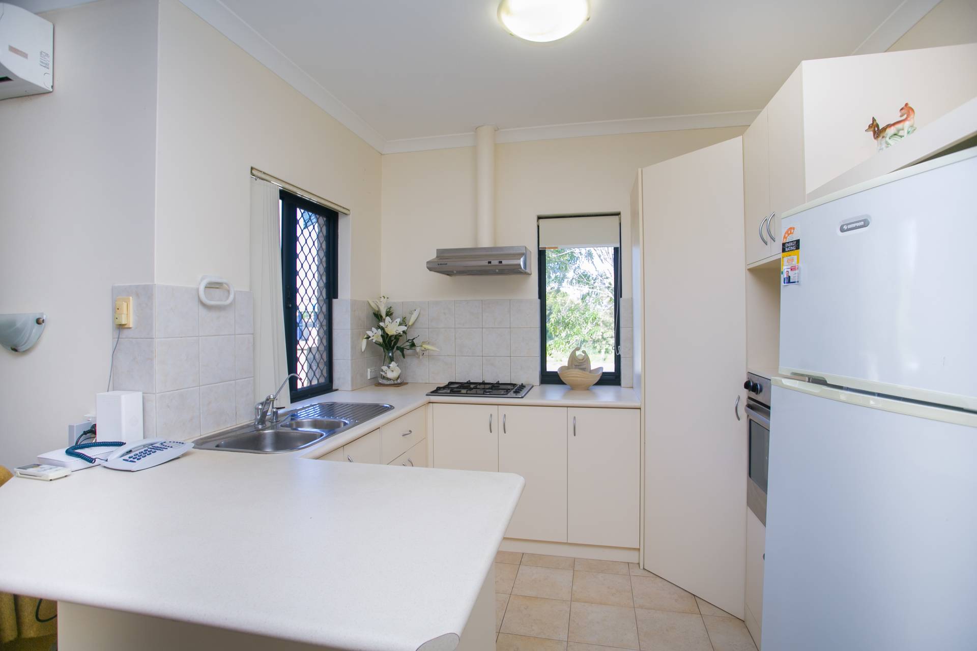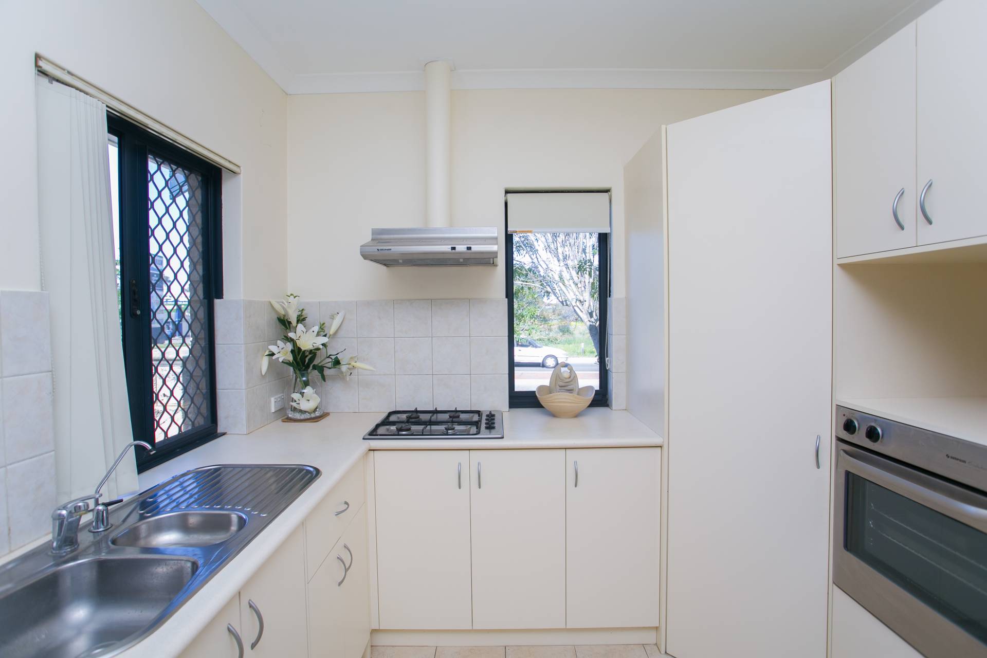 • The kitchen has plenty of bench and cupboard space, with a microwave and fridge recess, 4-burner gas cooktop, electric oven and rangehood.