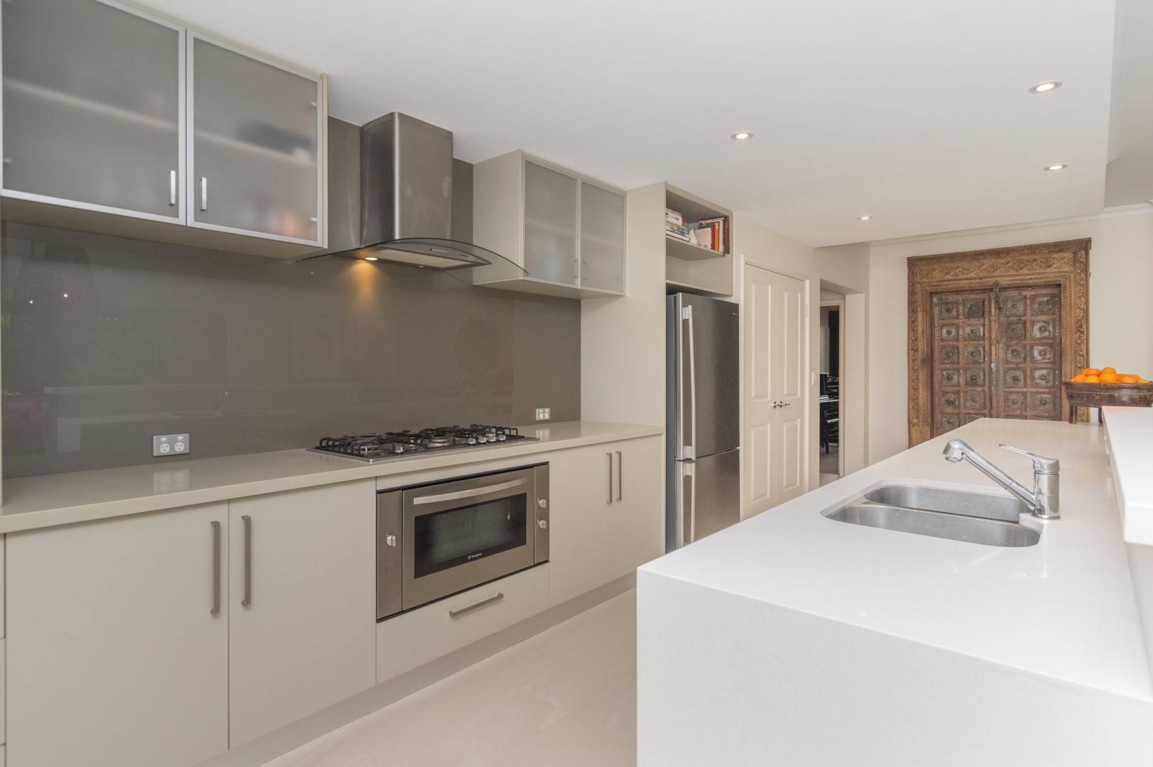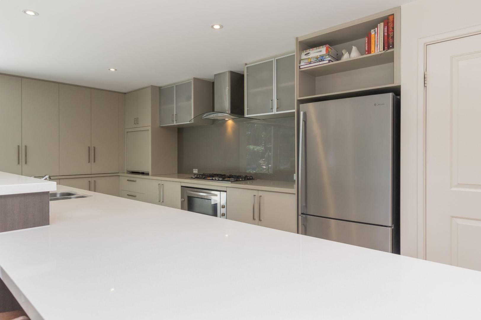 High quality versatile kitchen featuring stone bench-tops, stainless steel appliances, gas cooking, dishwasher, substantial cupboards and draws