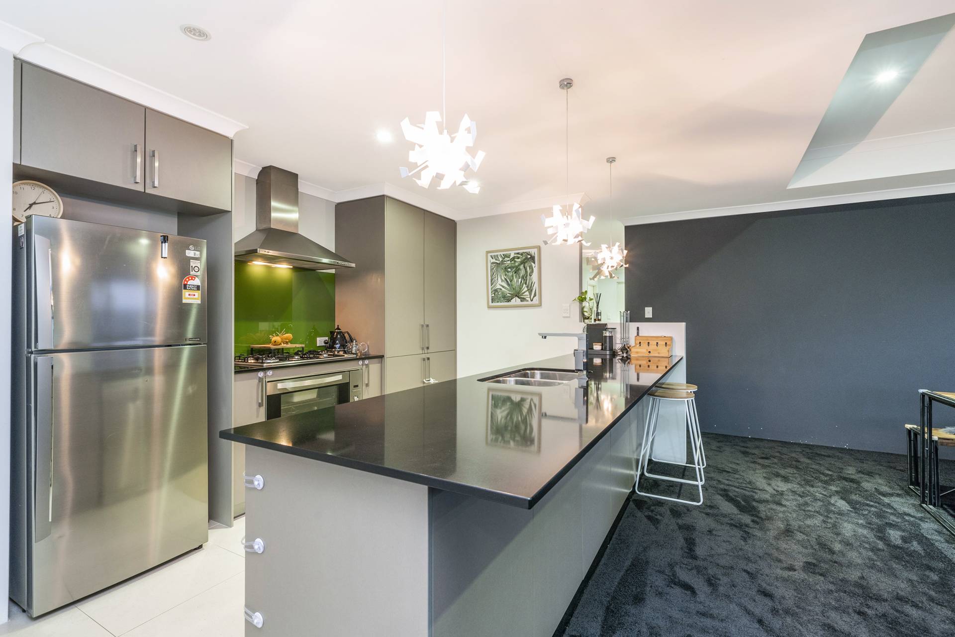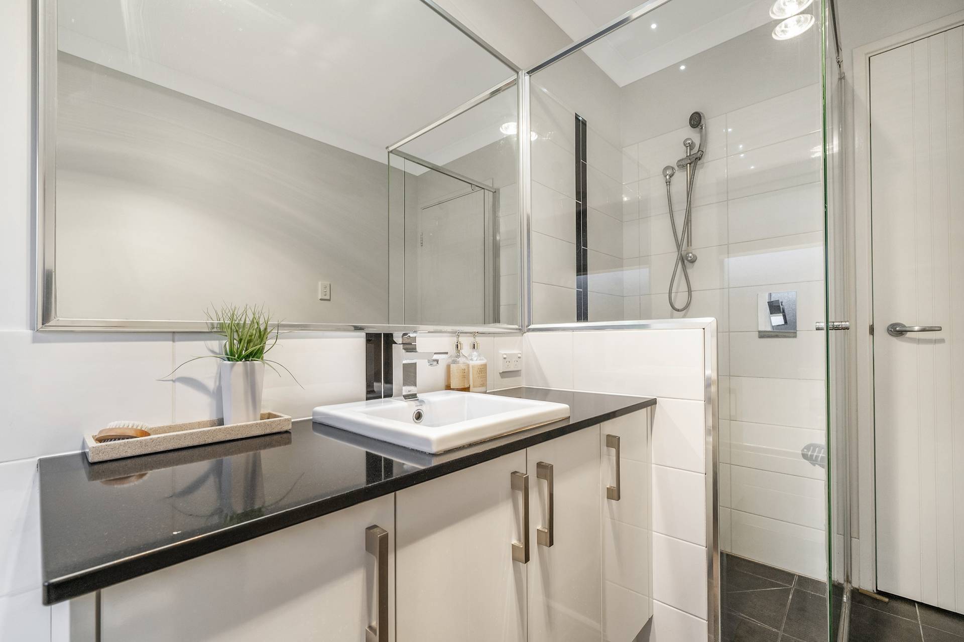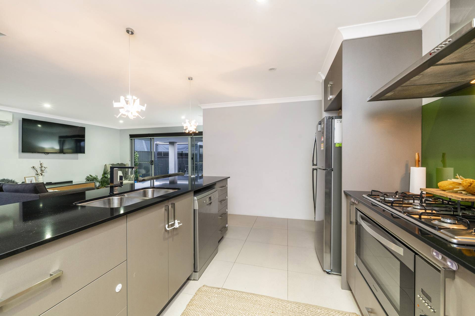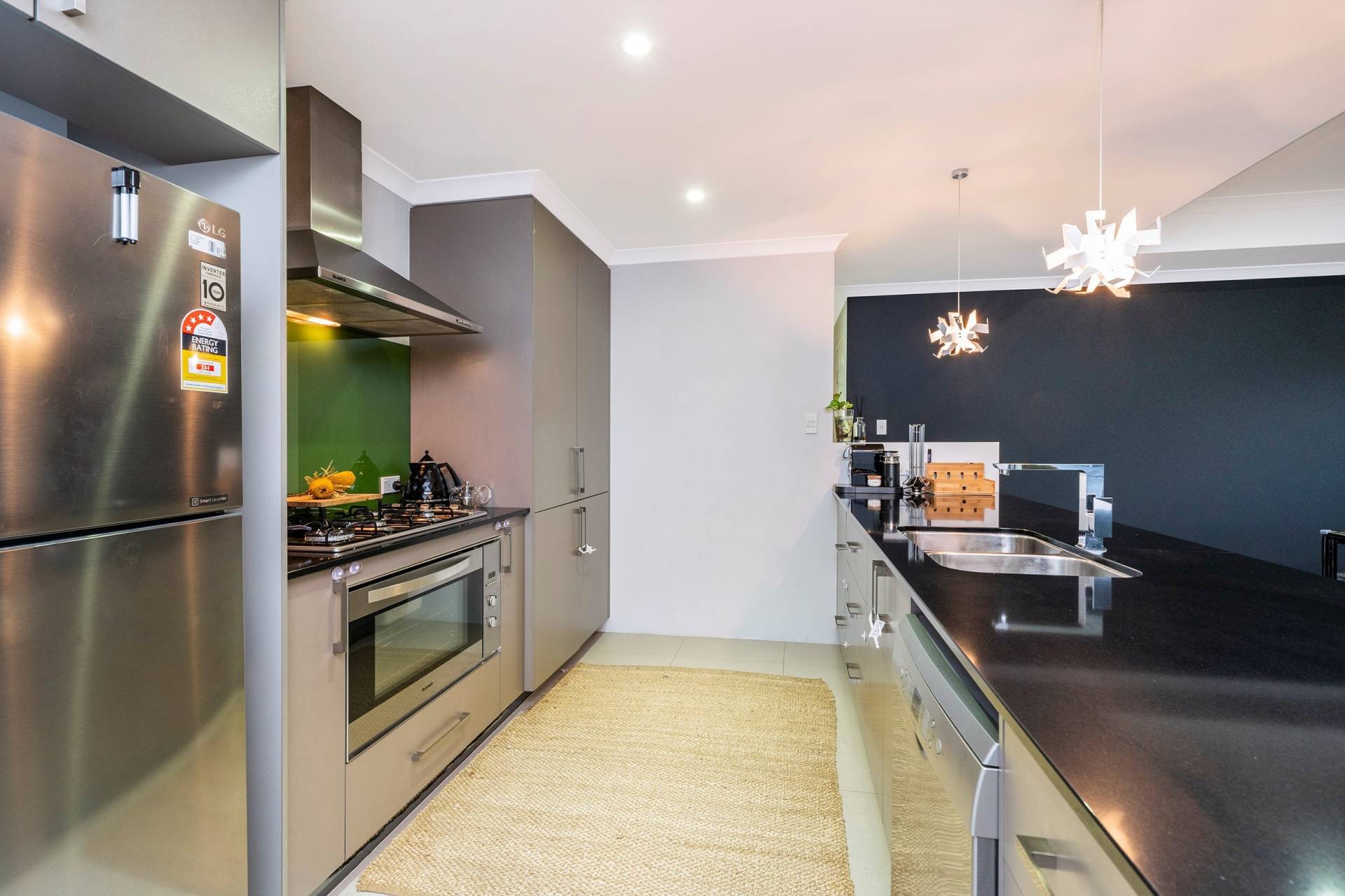 The galley-style kitchen offers plenty of cabinets, glass splashback, engineered stone benchtop and stainless steel appliances, including a dishwasher, electric oven, 5-burner gas cooktop and canopy rangehood. There's also a double sink with quality flickmixer tap fitting, large fridge recess and a double built-in pantry.