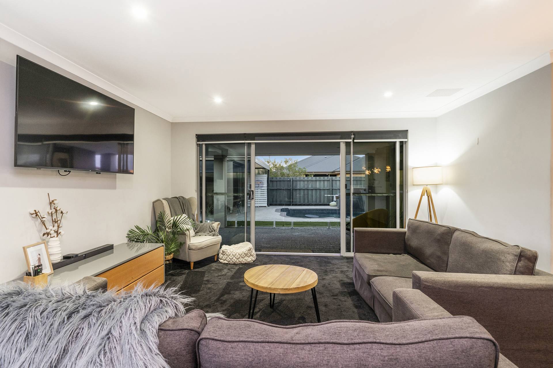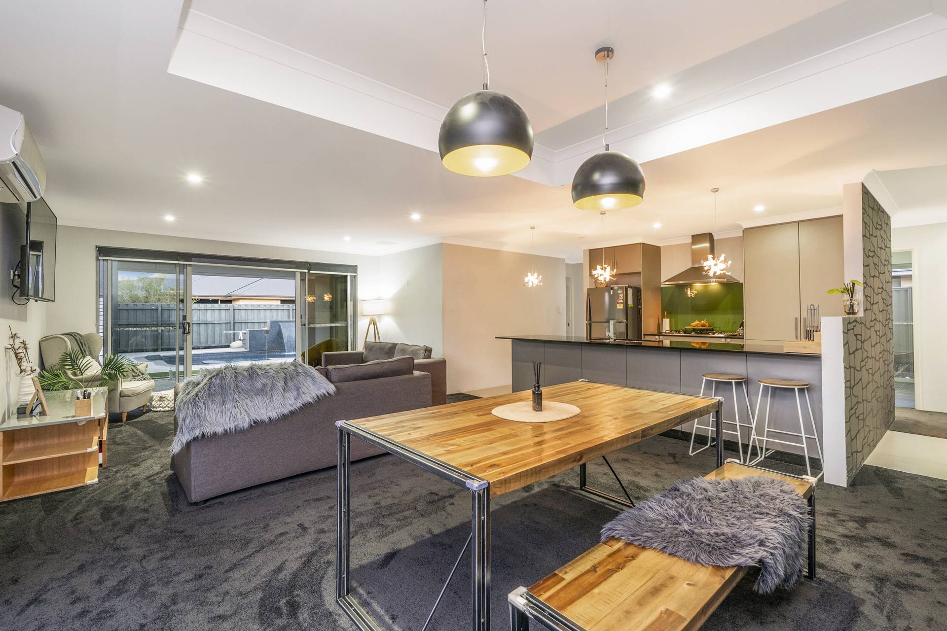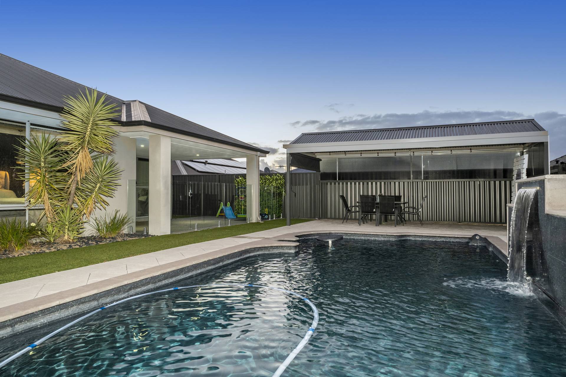 The expansive open-plan living and dining area is a beautiful space where you'll be able to enjoy your pool vista all year round. Double sliding doors open up to the spacious alfresco area, capturing the resort-style pool, cascading water feature and freestanding gazebo.