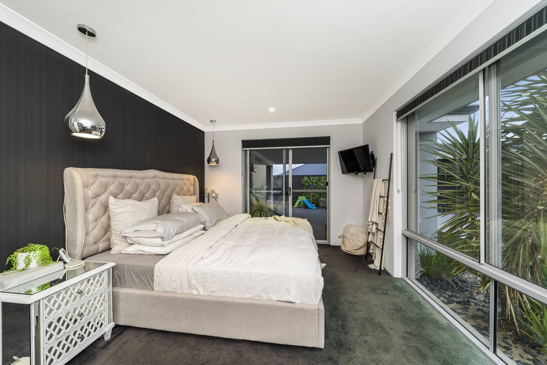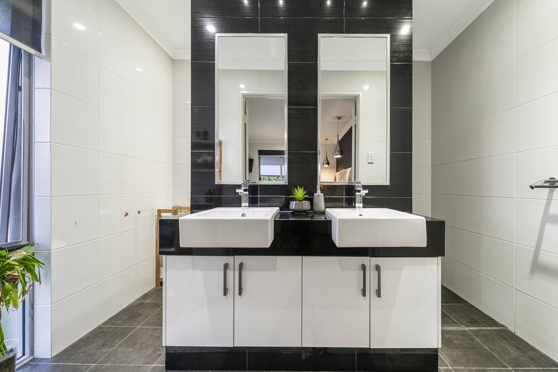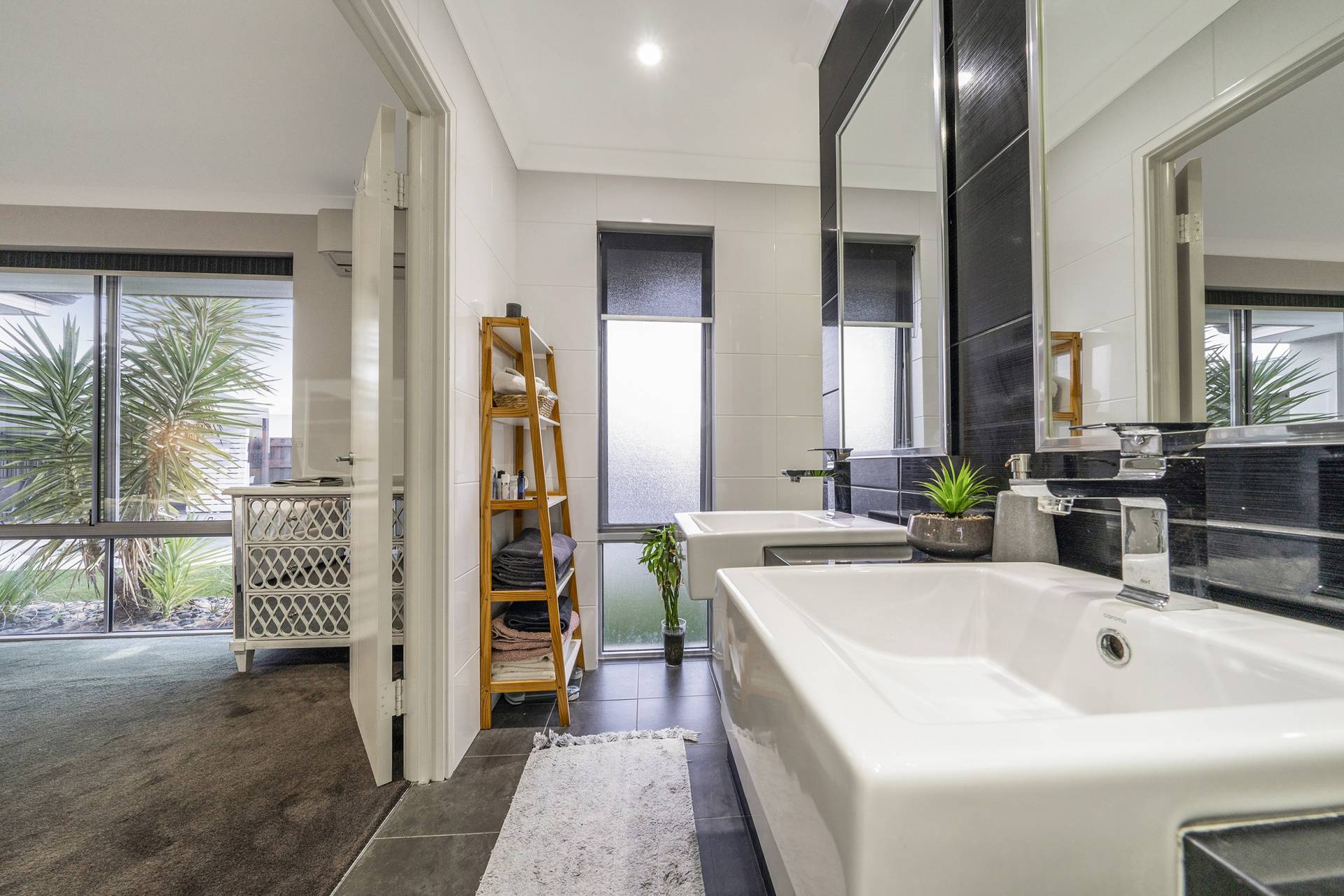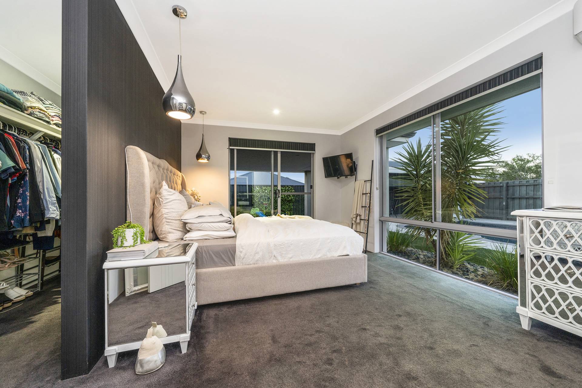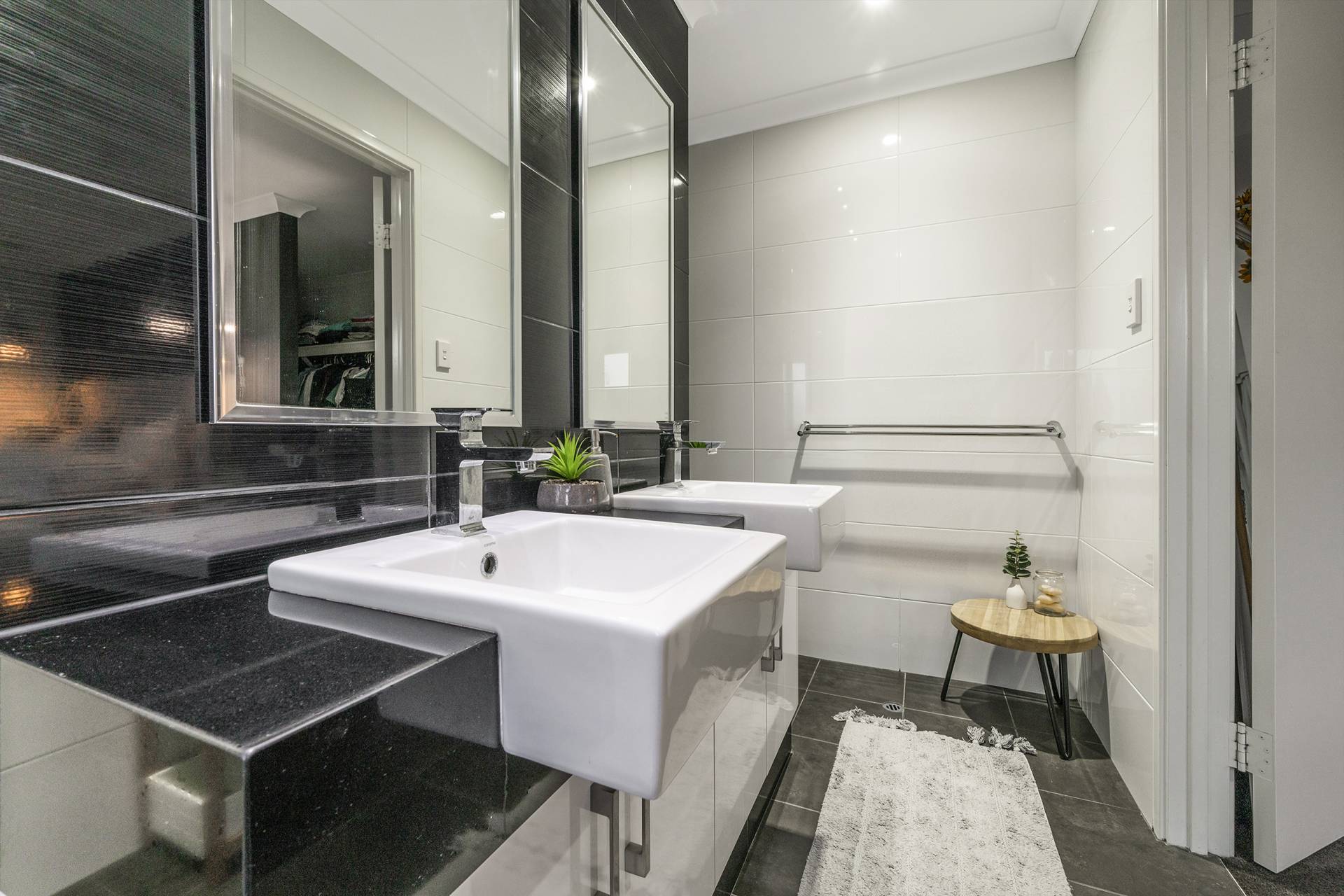 The right side of the property houses the bedrooms, with the glamour master suite at the rear, overlooking the stunning, resort-style pool area. This luxe 'adult retreat' boasts an elegant ensuite featuring twin recessed basins with stone tops, fresh white floor-to-ceiling tiling and concealed frameless shower and separate WC. There is also a generous walk-in robe behind the bed head, stylish pendant lighting and sliding door access to the alfresco area.