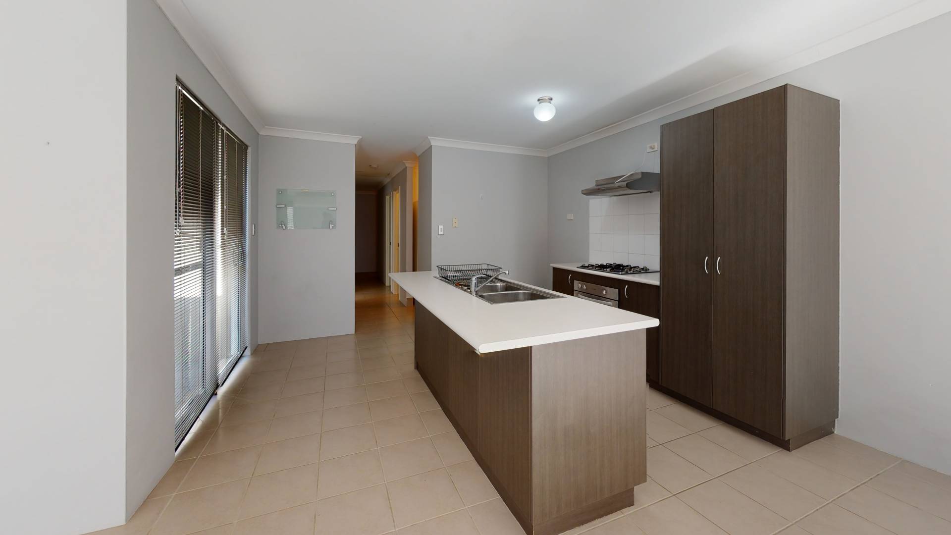 The open plan kitchen/meals and living area is filled with natural light and flows through to the courtyard through the sliding glass door.