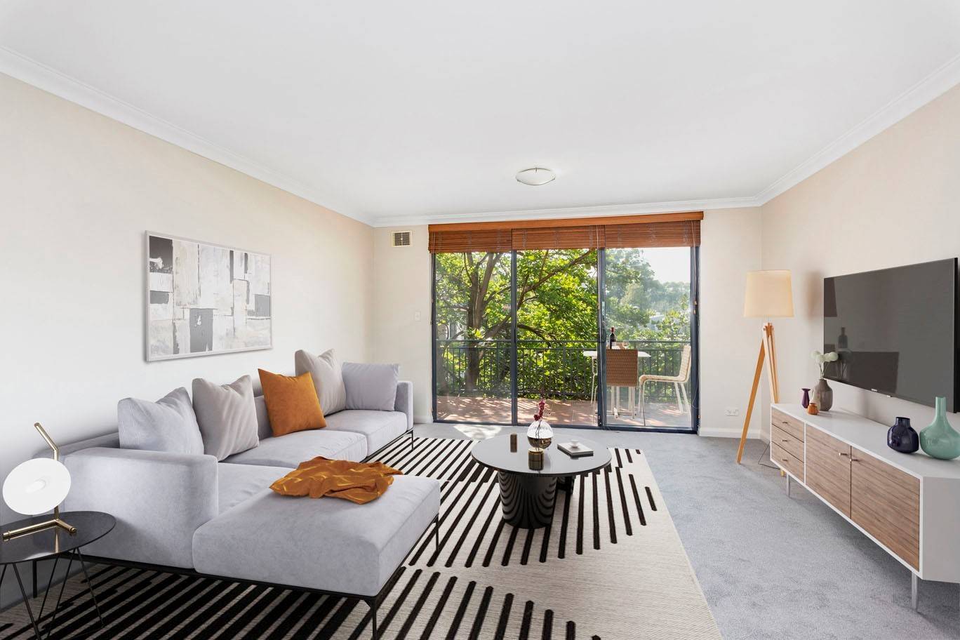 The master bedroom includes a built-in double mirrored robe and an ensuite, and the second bedroom has a walk-n robe. Timber Venetian blinds feature throughout the bedrooms and living area, which opens out to a balcony with a leafy pool outlook.