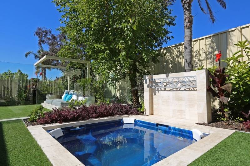 Separate glass fenced enclosed spa area with water feature, travertine paving and synthetic grass