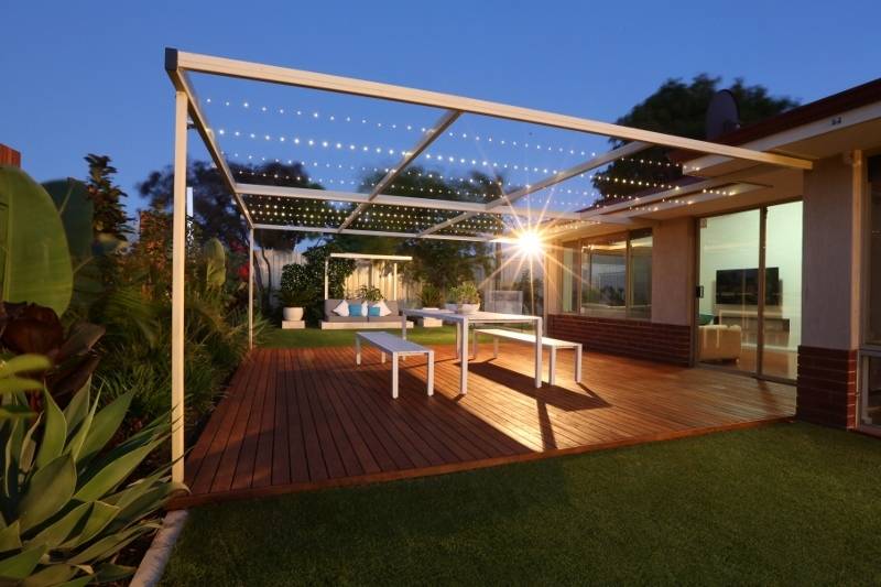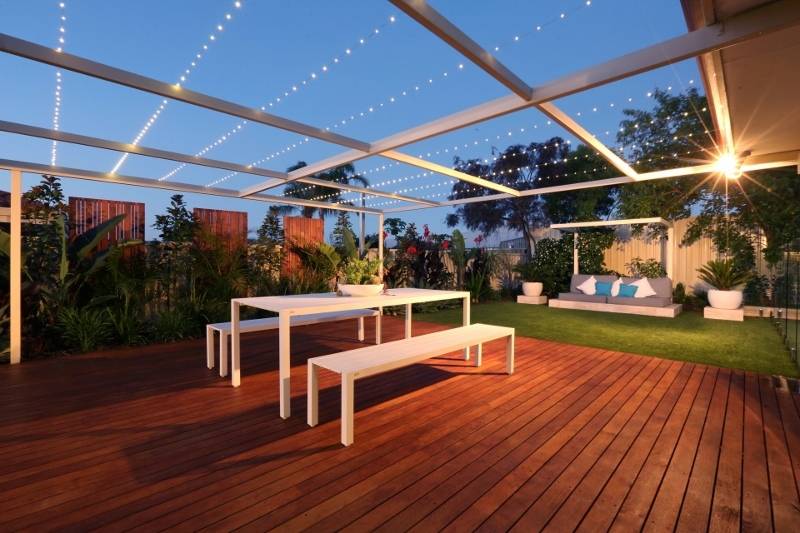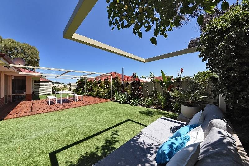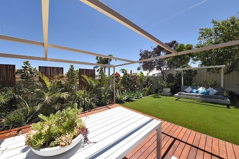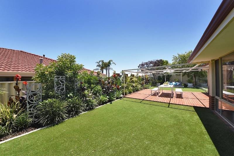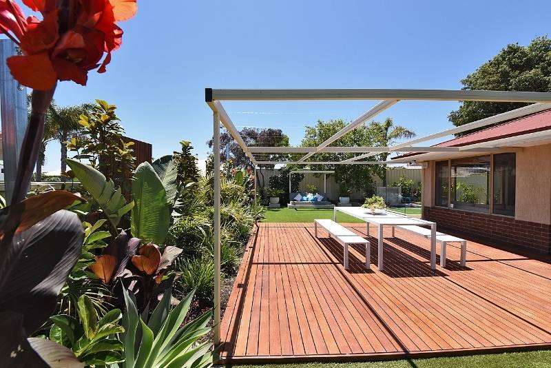 Sensational outdoor entertaining area designed to perfection with feature decked area and separate daybed surrounded by immaculate gardens and easycare synthetic grass