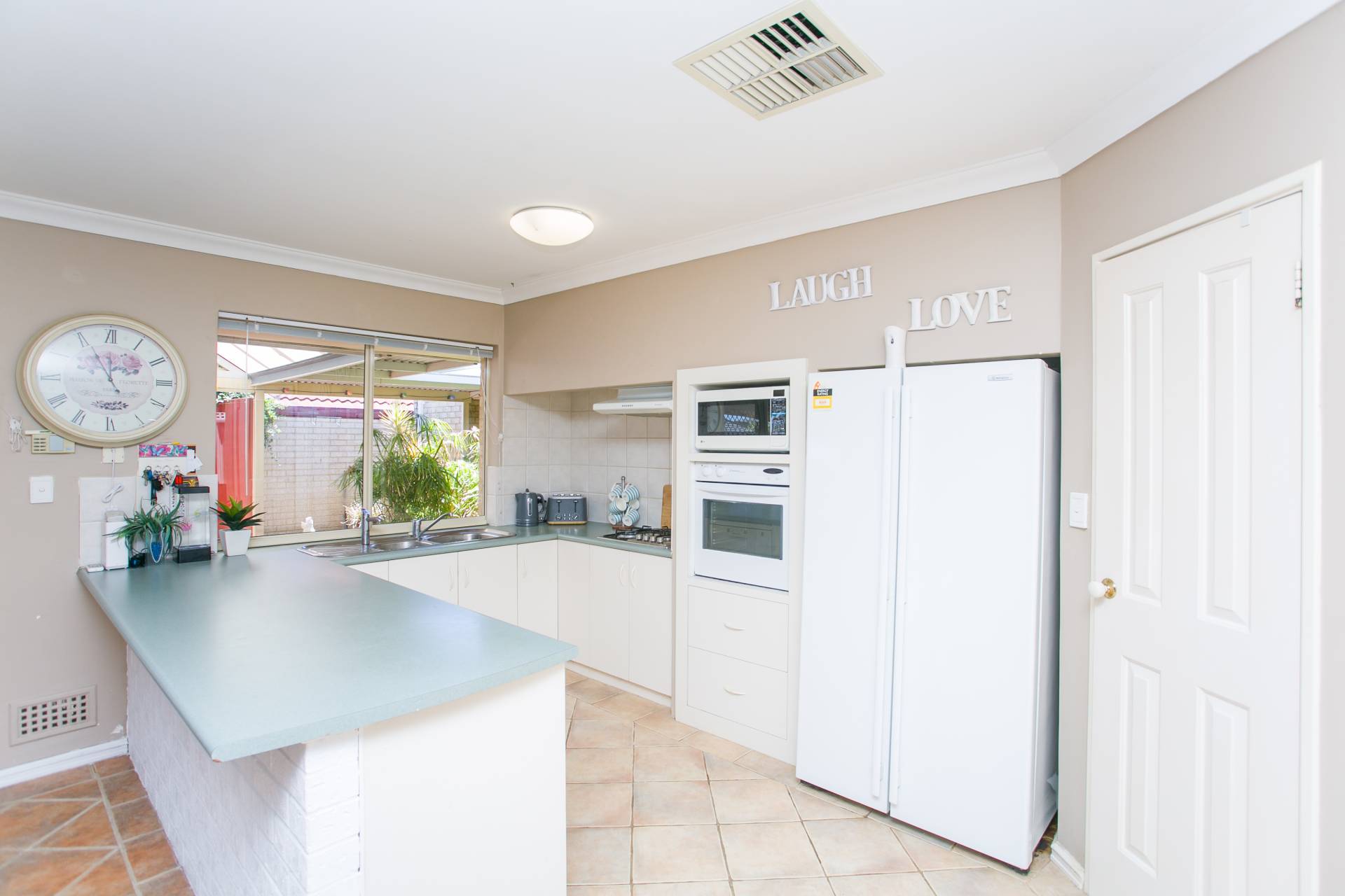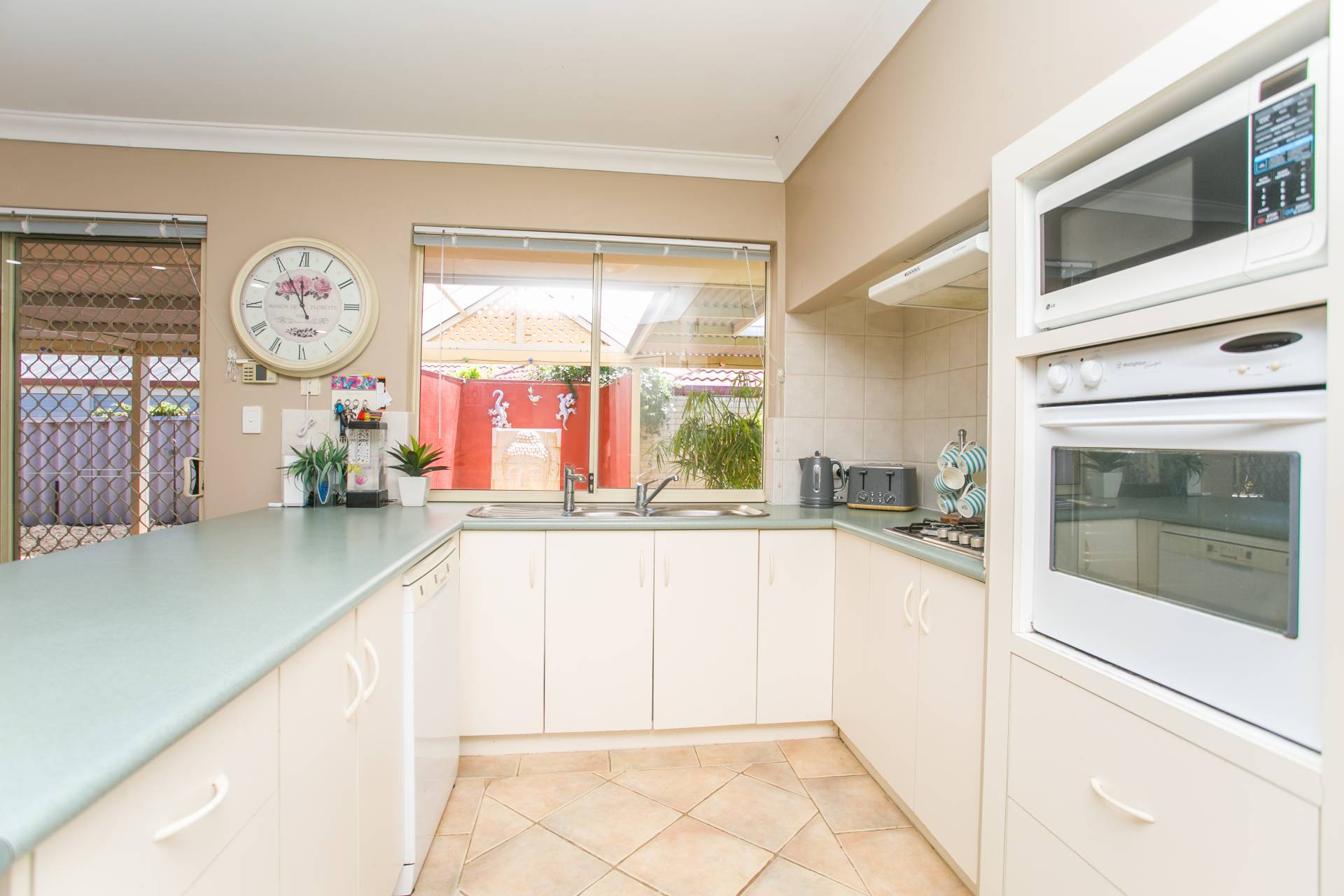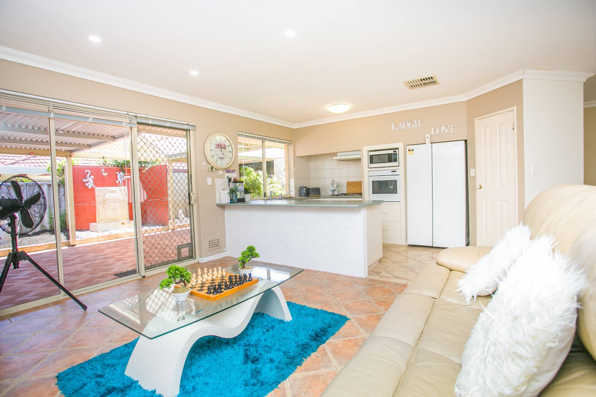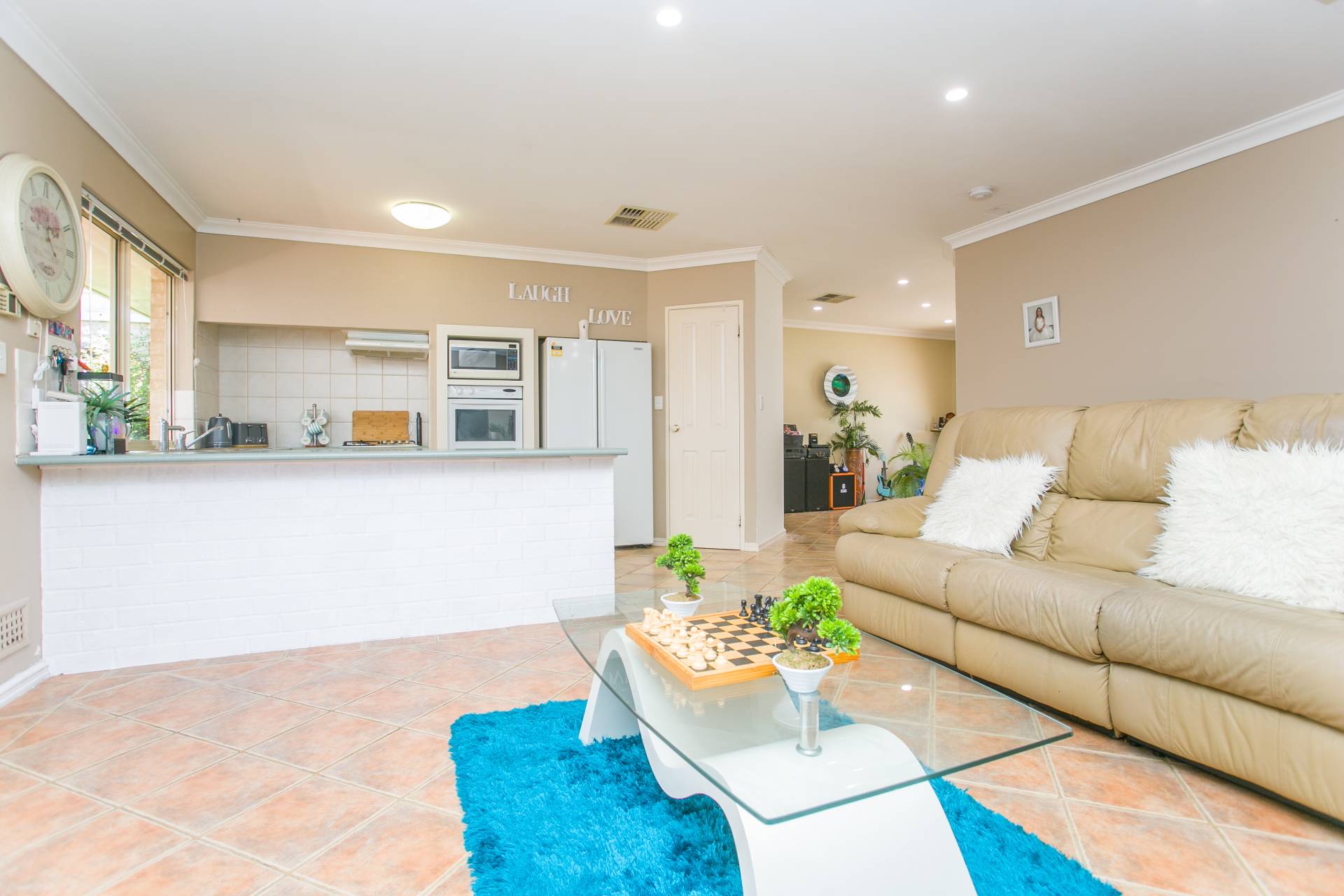 At the centre of this lovely home is an open-plan, tiled living area, which is overlooked by the kitchen and flows outside to the expansive pergola.