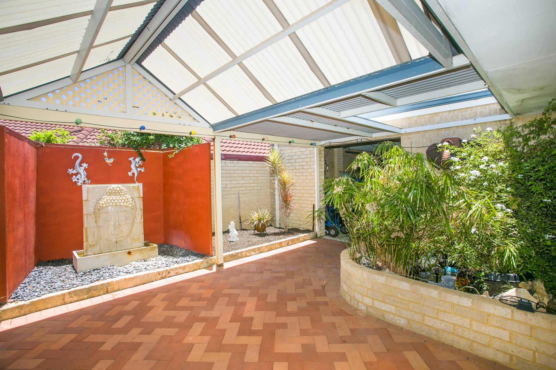 Outdoors an enormous pitched pergola and 'zen' garden with Buddha water feature and bamboo provide the perfect setting for alfresco entertaining, and there's still ample lawn and garden area for the kids and/or dog to enjoy backyard games.