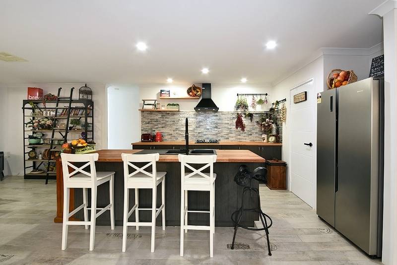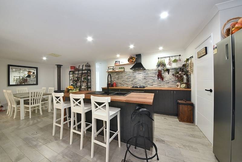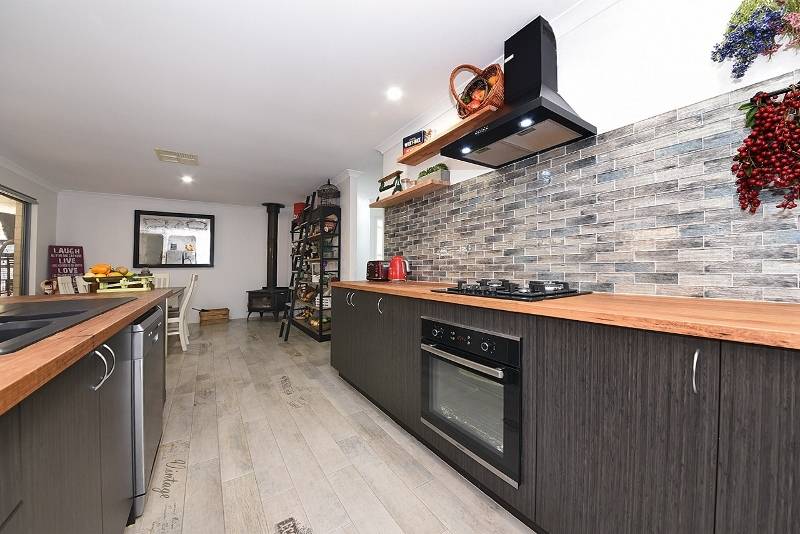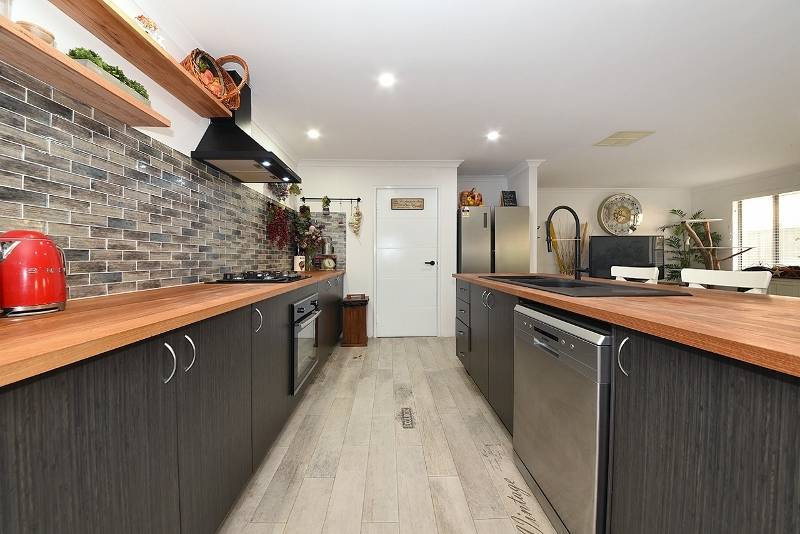 Well designed, fully renovated central kitchen with feature wood benchtops, 4 burner gas hotplate, underbench oven, rangehood, dishwasher, fridge/freezer recess, stylish tiled splashbacks and ample bench and cupboard space