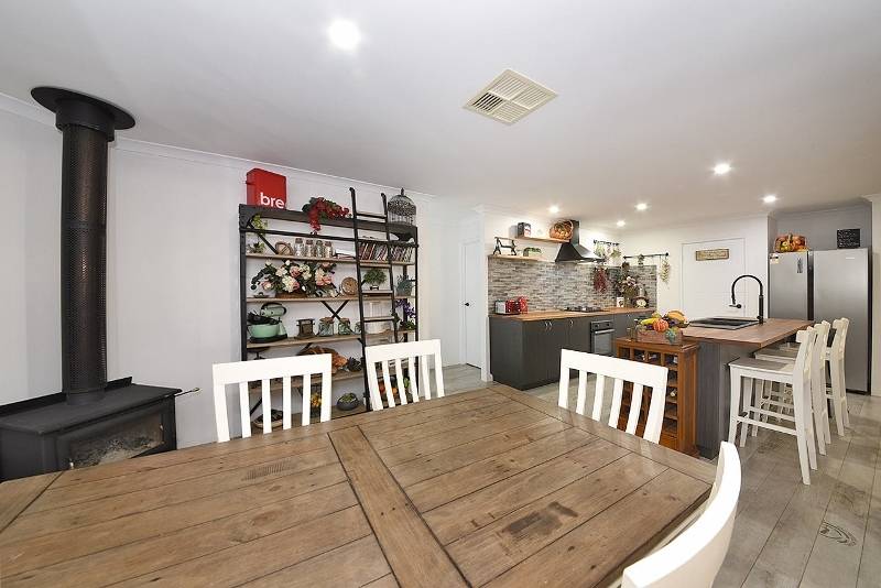 Spacious open plan meals and living room with inbuilt wood fire plus split system air-conditioning