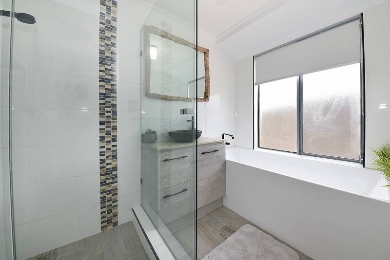 Fully renovated 2nd bathroom with extra deep bath, shower (with screen), full height tiling and stone benchtop, all finished with modern fixtures and fittings