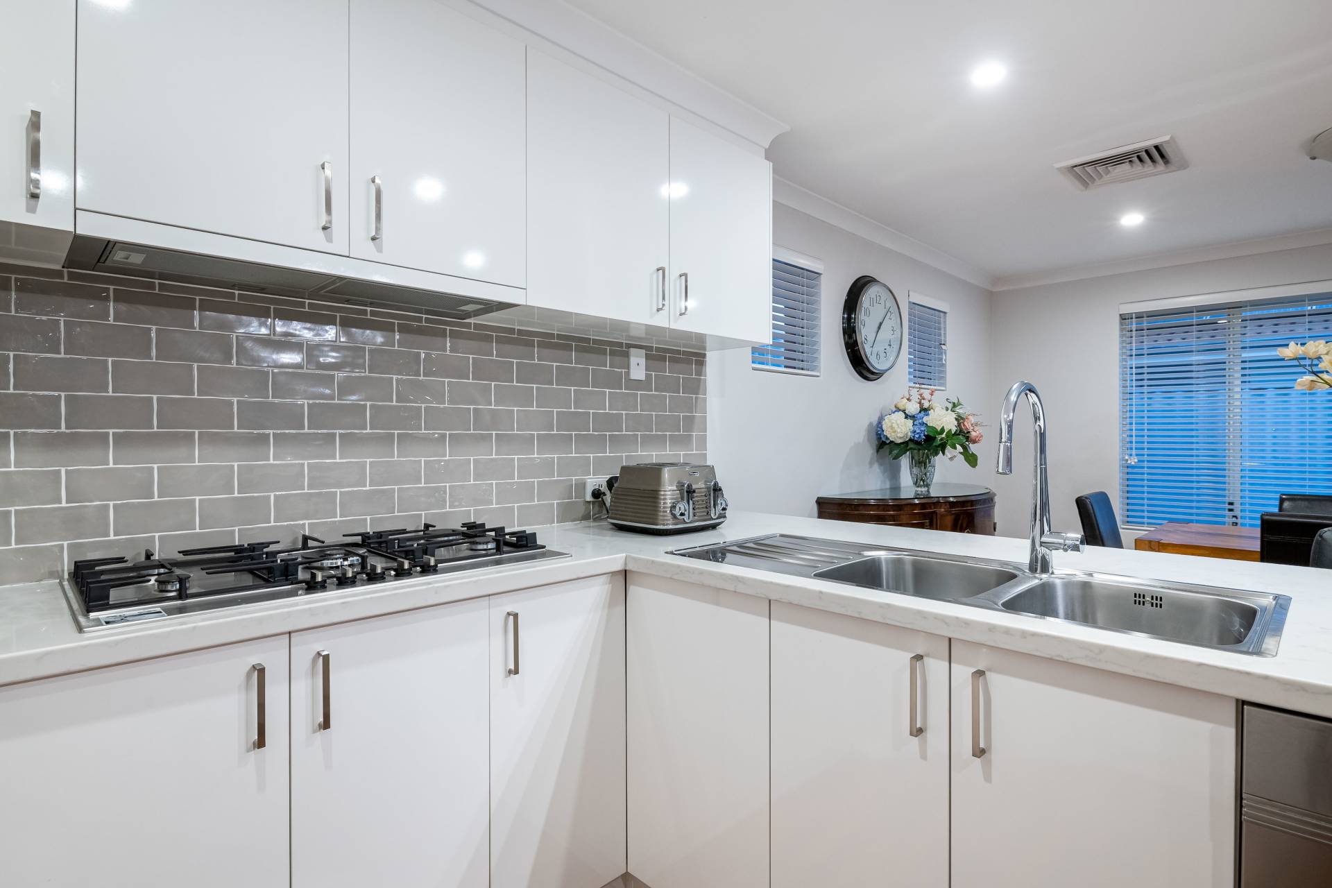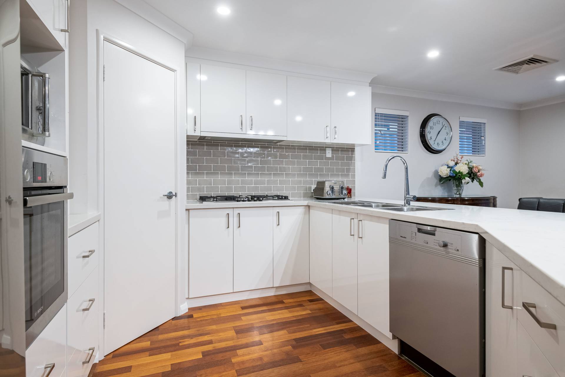 - newly renovated kitchen with soft closing doors, stone benchtops, step-in pantry and appliance hideaway. Fitted with Bosch gas cooktop and electric oven (which is self-cleaning pyrolytic), Meile dishwasher and plumbing in place for water to the fridge.