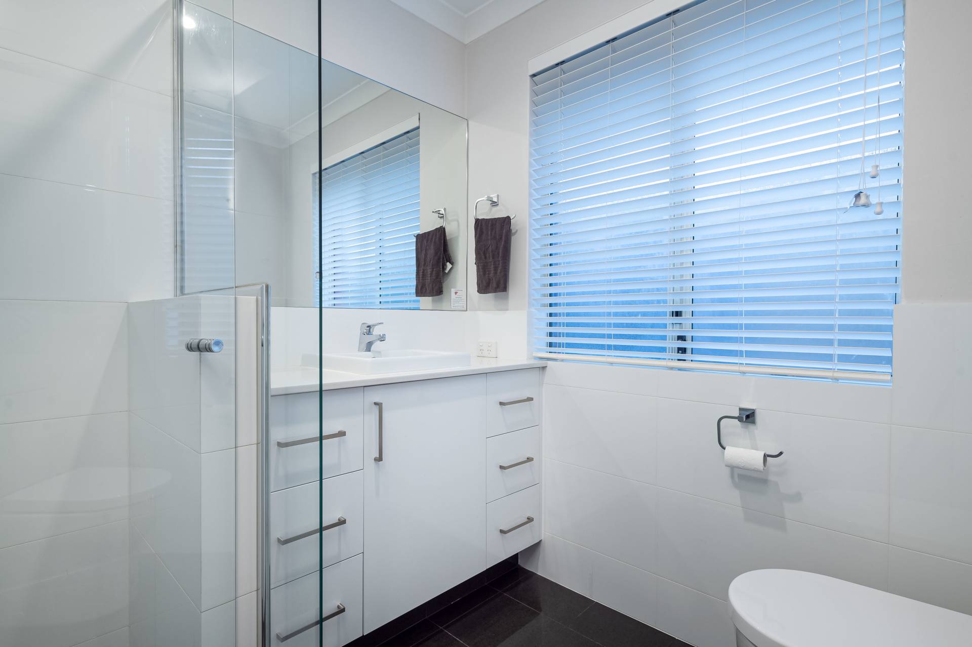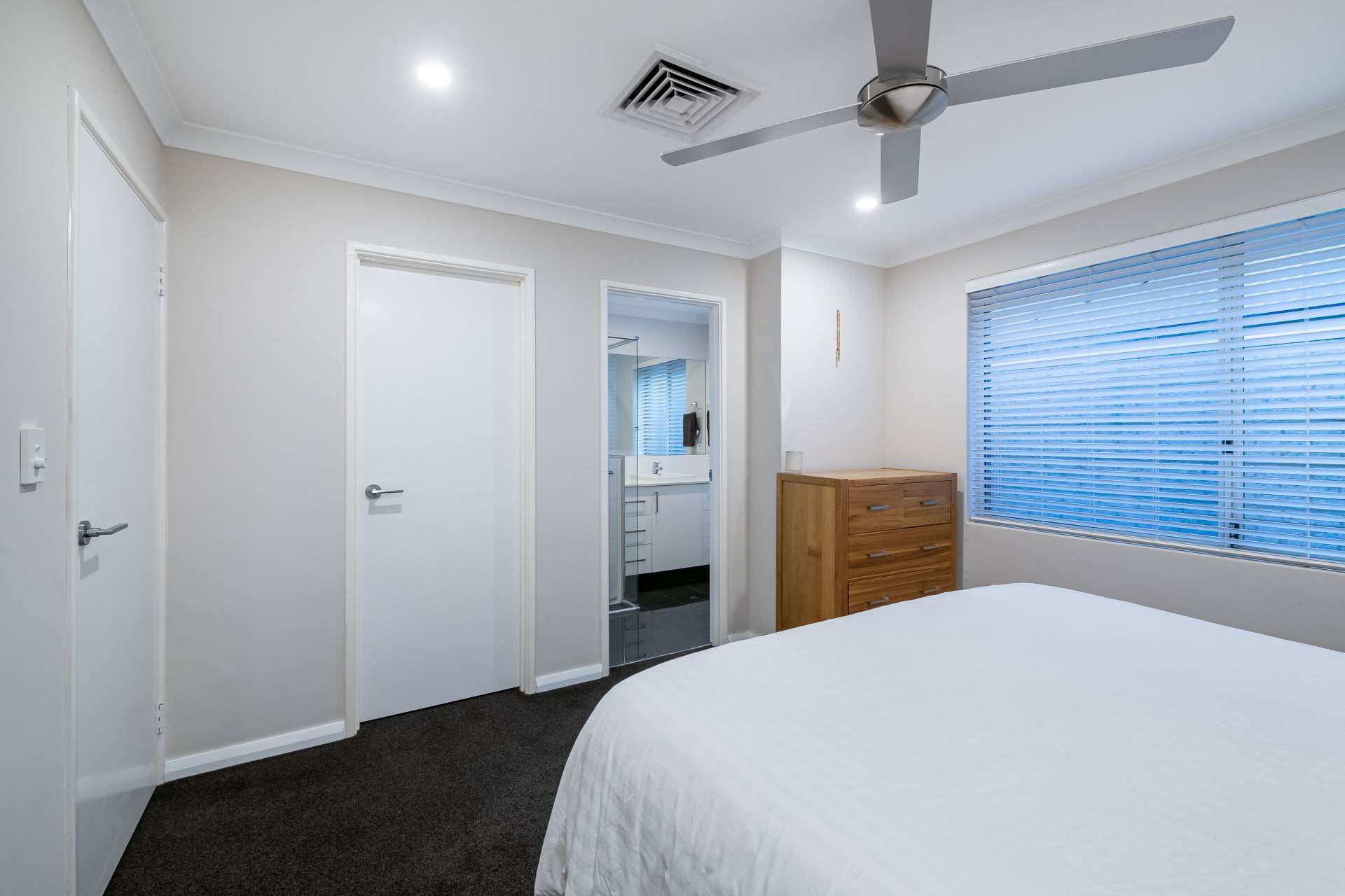 - The master bedroom is light and bright, complete ceiling fan, walk-in robe and ensuite with rain-head shower head and heated towel rail.