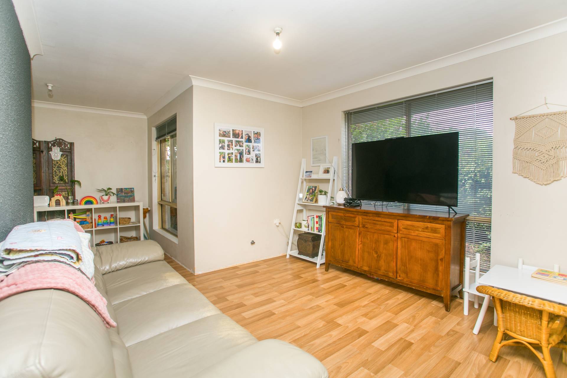 The bedrooms are all a good size and have carpet, ceiling fans and venetian blinds, and the master bedroom has a triple built-in robe. Timber-look vinyl flooring throughout the kitchen, living and dining areas is easy-care, and there is tiling to the wet areas.