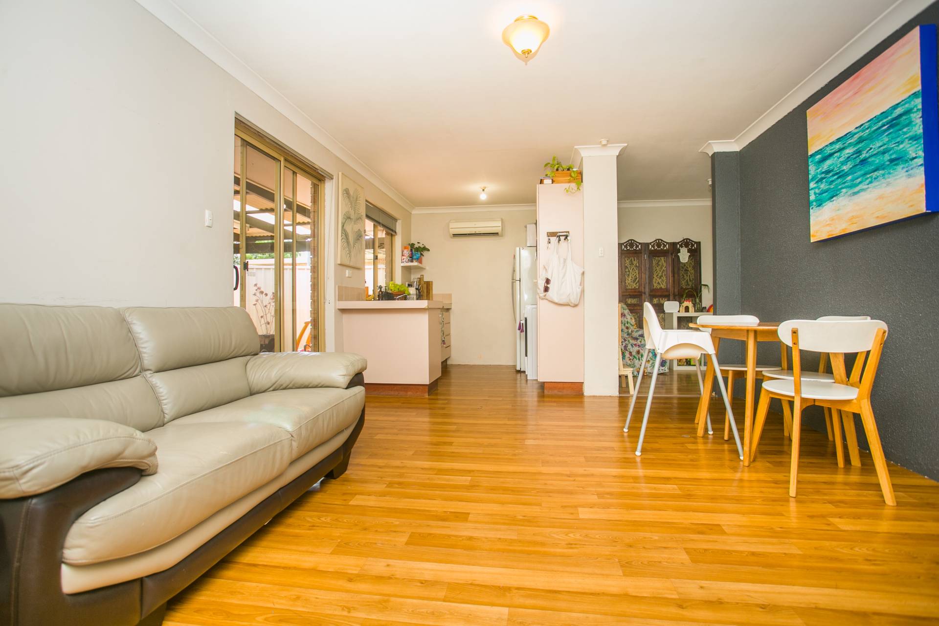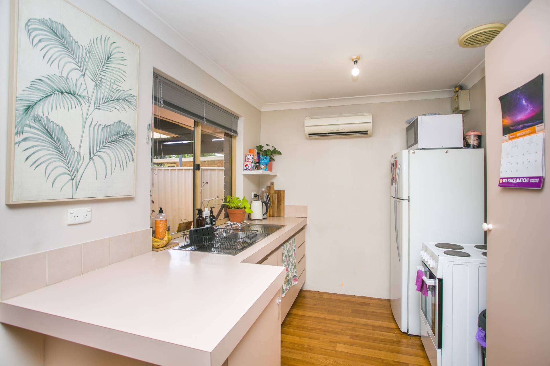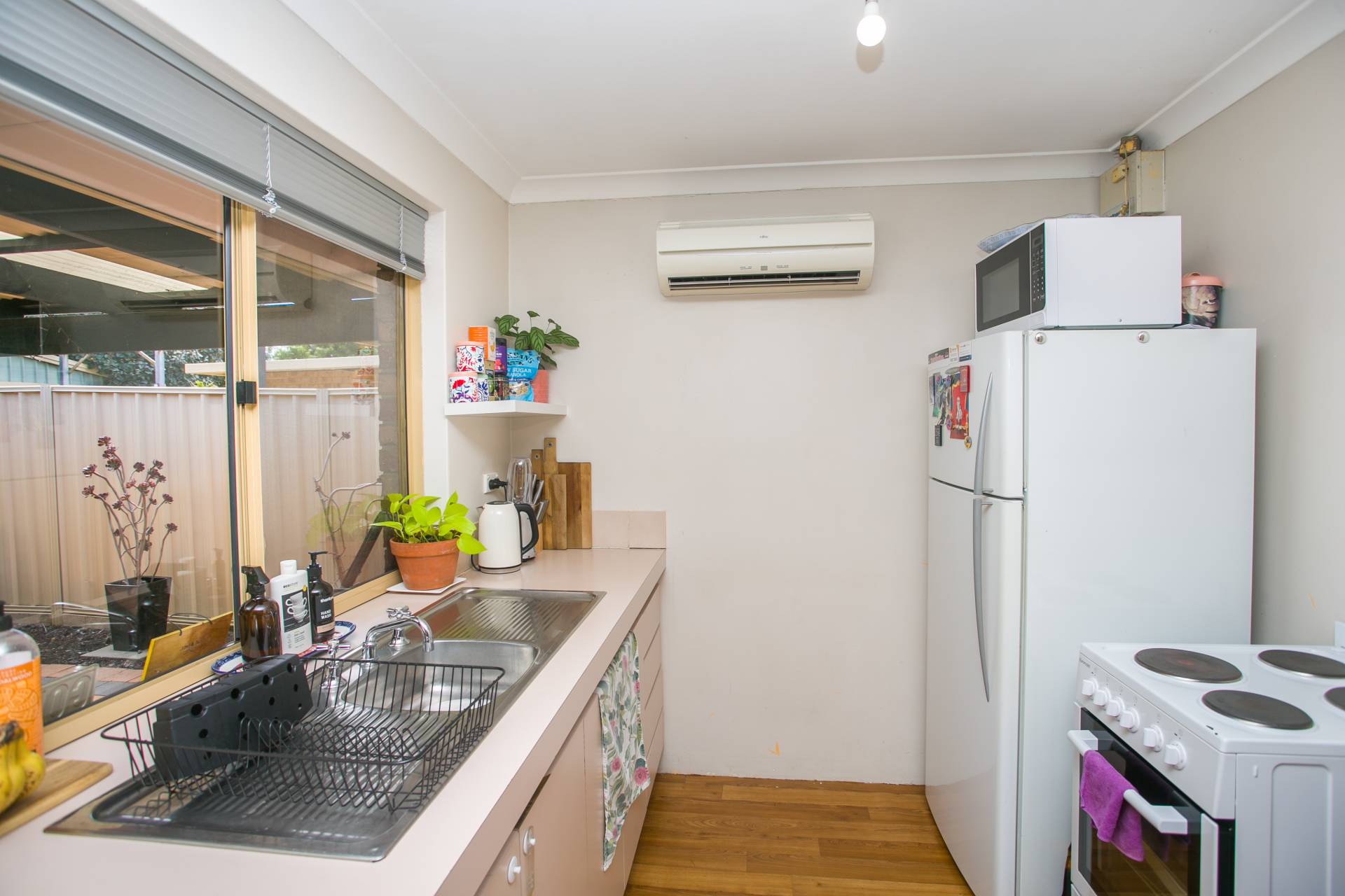 The functional kitchen features a split system air conditioner, 4-burner electric cooktop and oven, large fridge space, pantry and pleasant outlook to the rear alfresco. The bathroom includes a single vanity, shower and bath, with the WC conveniently separate.