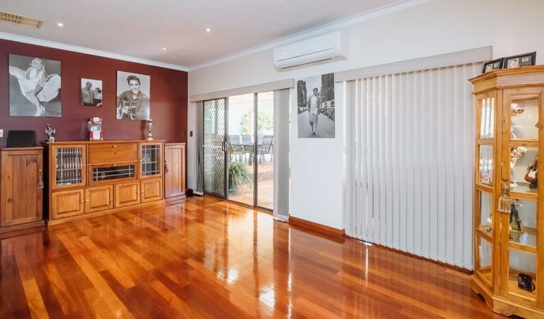 -The spacious family room connects to a fabulous separate games room with its gorgeous polished Jarrah wood flooring, split reverse cycle air-conditioning and opening onto the magic outdoors beyond.