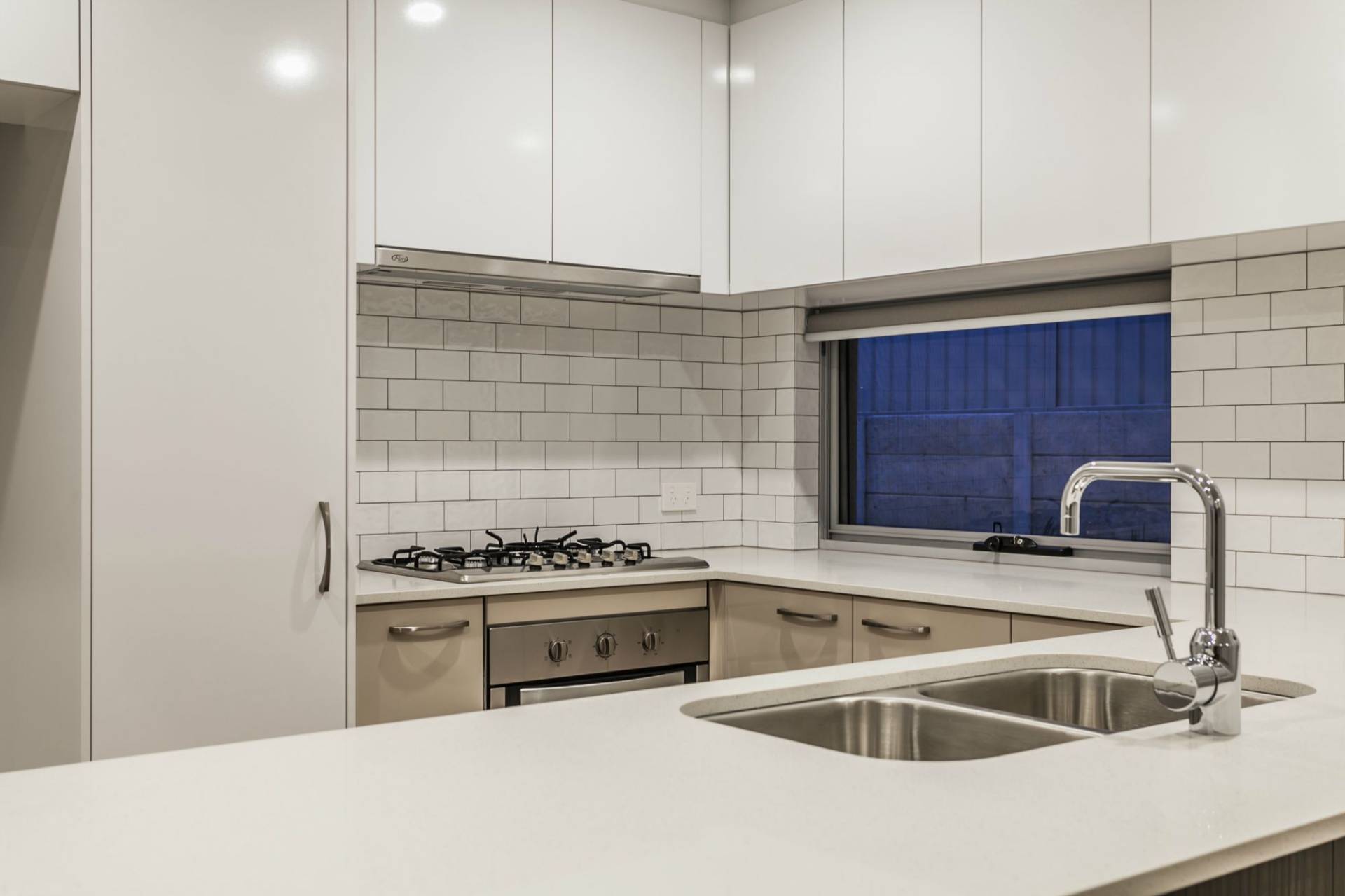 - Waterfall edge in kitchen with stainless steel kick boards, Stone top bench tops & Externally ducted range hoods