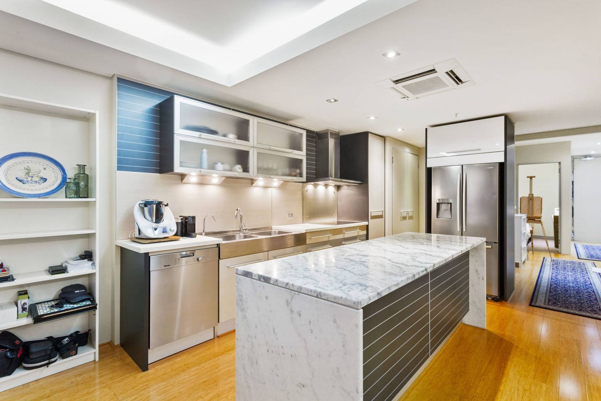 - Stylish kitchen featuring marble bench top, glass splashbacks completed induction cook top, dishwasher, and microwave and fridge