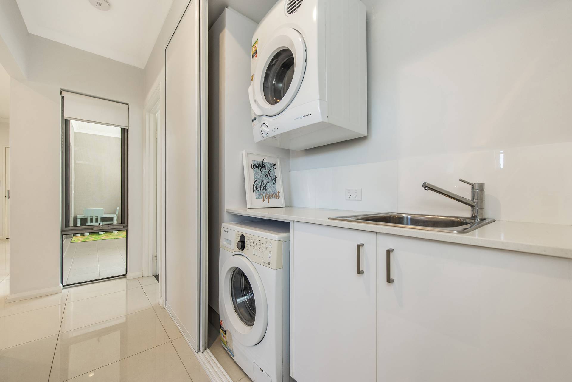 The second bedroom is a good size with built in robe, serviced by the second bathroom and there is a European style (cupboard) laundry.