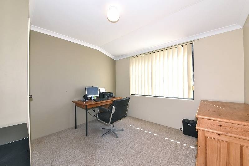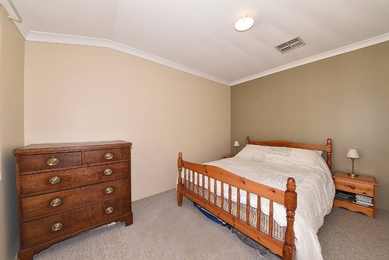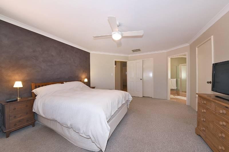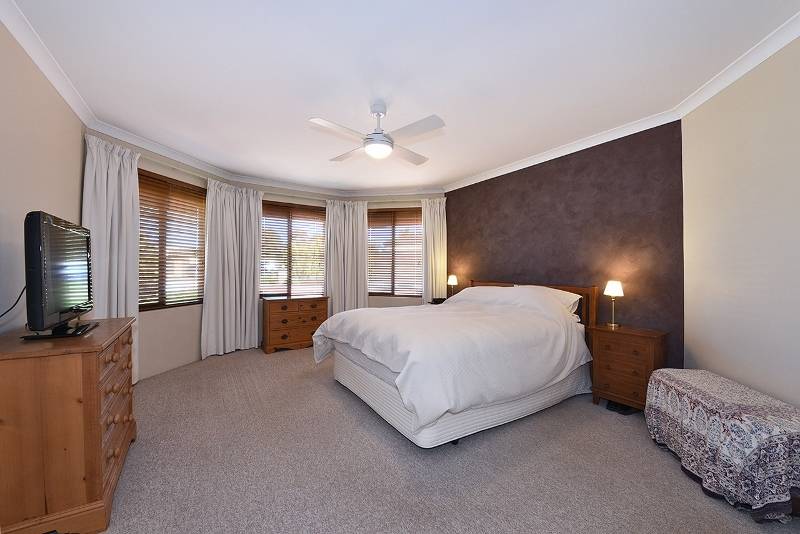 Spacious master bedroom with separate his and hers walk in robes, TV point, ceiling fan and roller shutters to windows