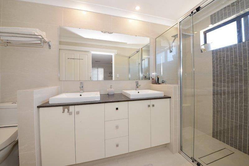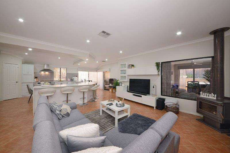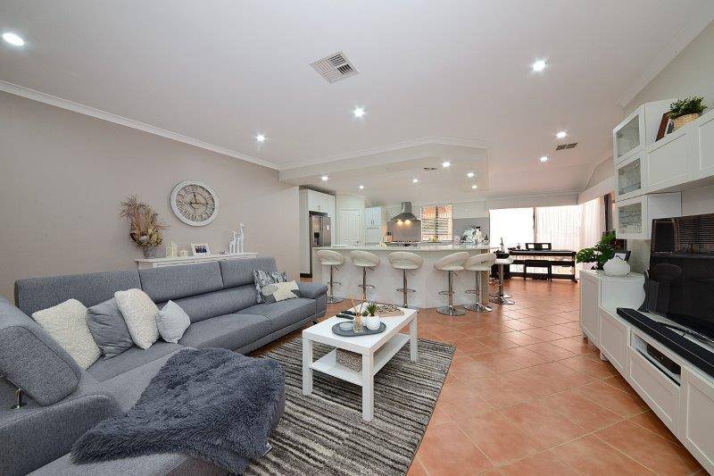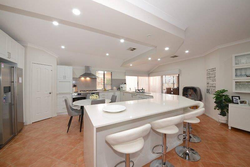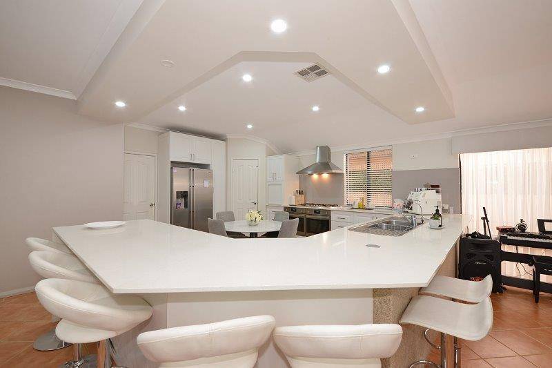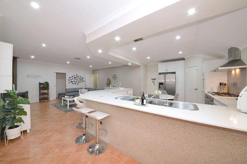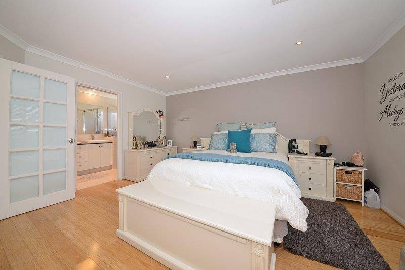 Enormous open plan family, dine with chef’s size kitchen, los of cupboards, drawers and storage space. Stone bench top with b/f bar, dishwasher, gas cooktop, f/f recess and shopper’s entrance. Four bedrooms, 2 bathrooms. Huge master bedroom,  ensuite with floor to ceiling tiling, double vanity, separate WC. Bedrooms 2, 3 and 4 all with BIRs and access to extra play room, central family bathroom with floor to ceiling tiling.