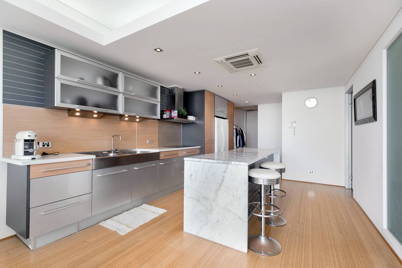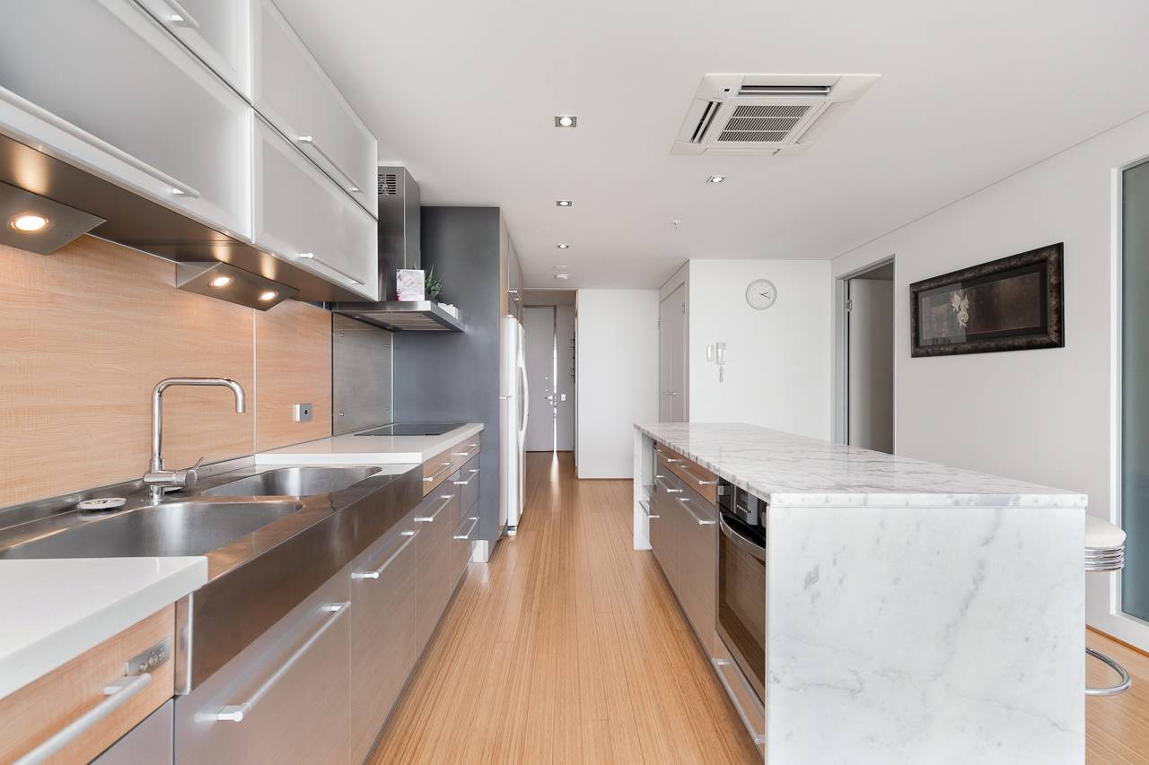 Stylish kitchen fitted with stone and granite benchtops, opaque feature glass cabinetry, stainless-steel appliances and an island breakfast bar encouraging a casual atmosphere