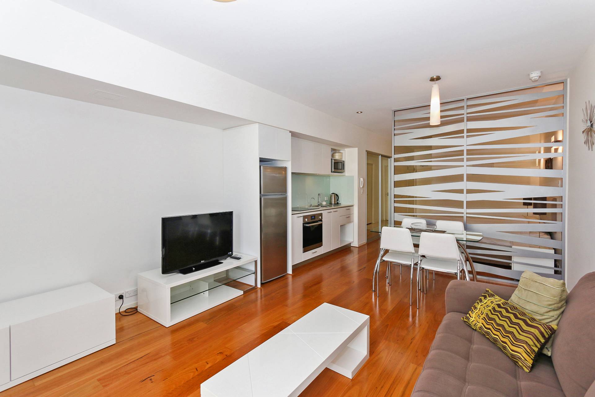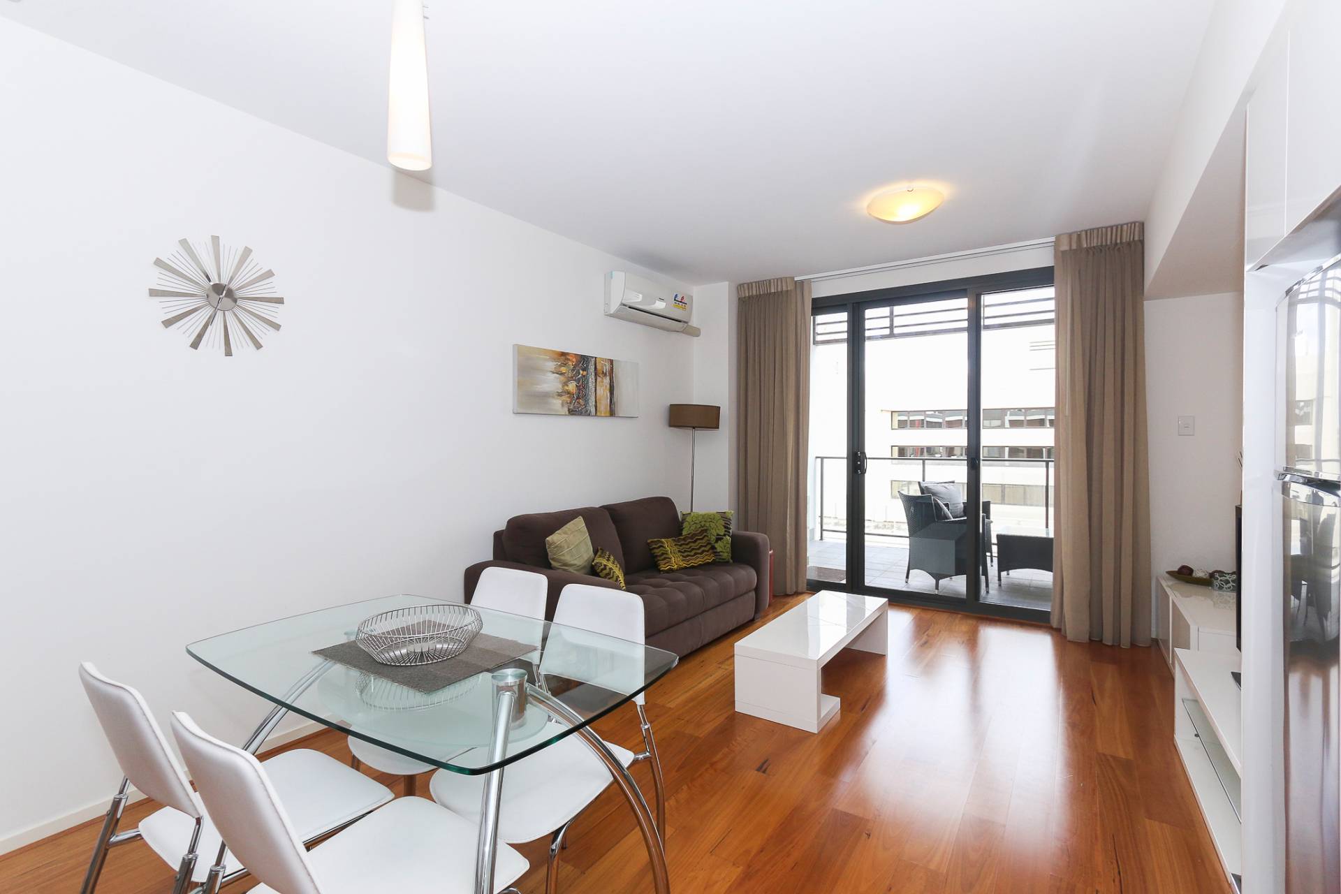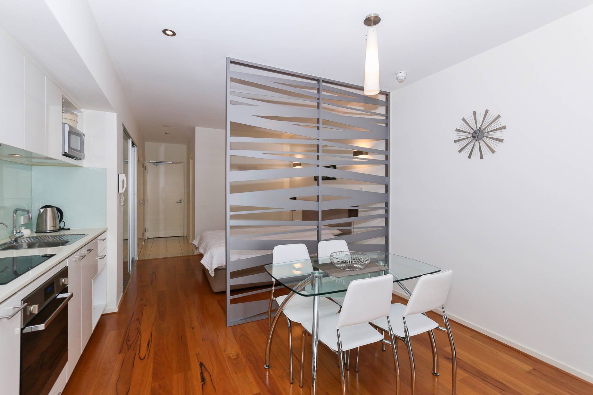 - Polished timber floorboards