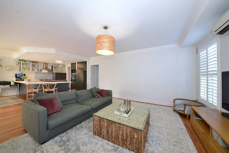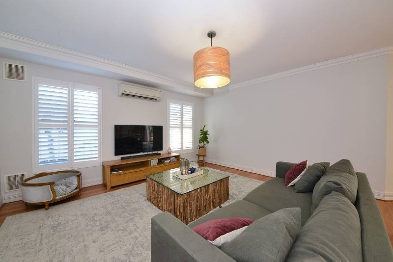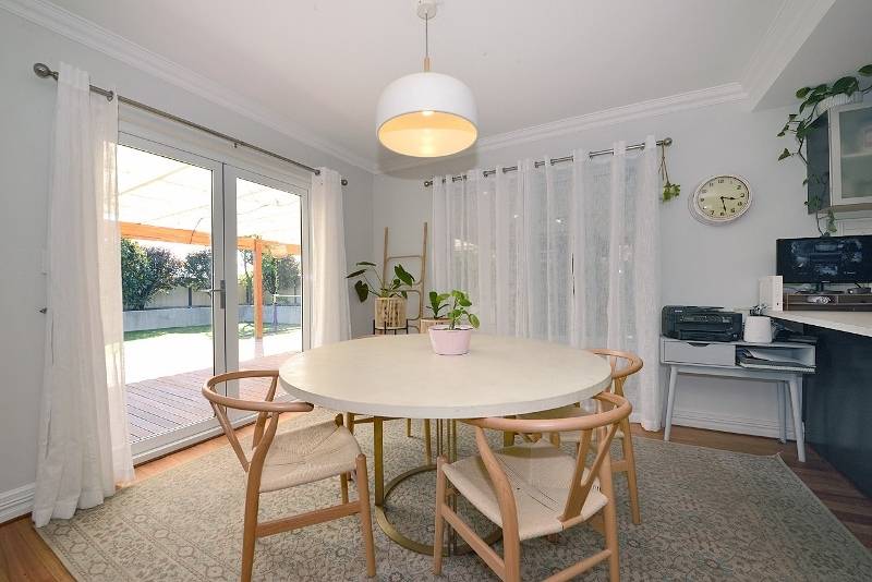 Open plan meals and living areas with feature plantation blinds, split system R/C air-conditioning and door access to outdoors
