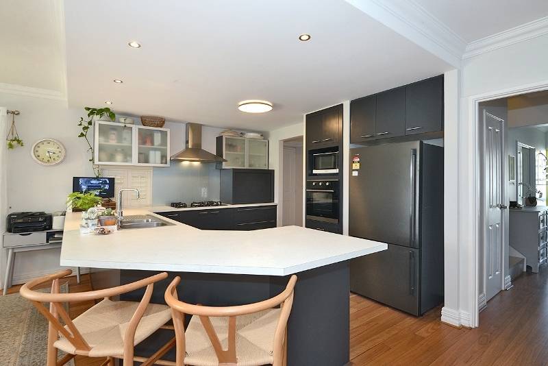 Splendid kitchen with plenty of bench and cupboard space, wall oven, 5 burner cooktop and rangehood, glass splashback, microwave recess, fridge / freezer recess separate appliance cupboard with roll up door as well as feature overhead cupboards