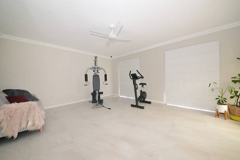 Massive enclosed gamesroom with stylish tiled flooring, ceiling fan and sliding door access to outdoors