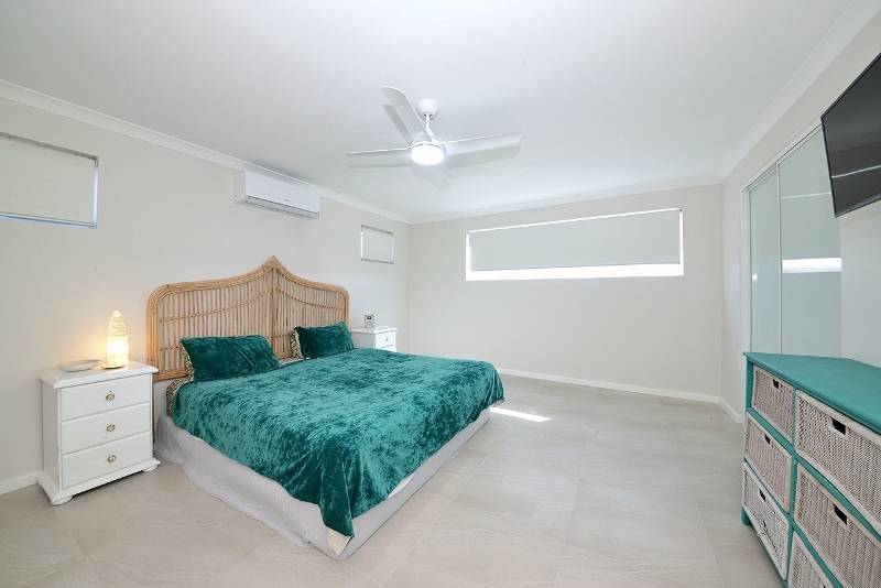 Resort styled master bedroom with feature tiled flooring, spacious walk in robe and split system R/C air-conditioning