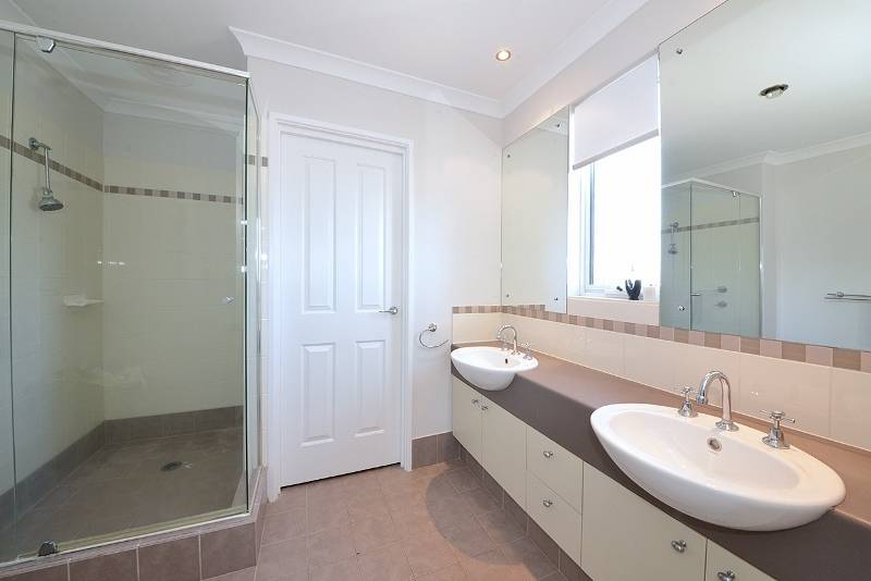 Sizable ensuite with extra length shower (with screen), full length bench, twin vanities and enclosed WC
