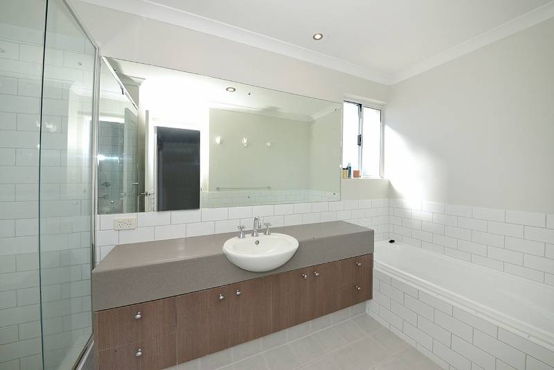2nd bathroom with extra length bench/mirror, bath and shower with glass screen
