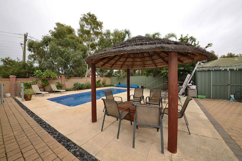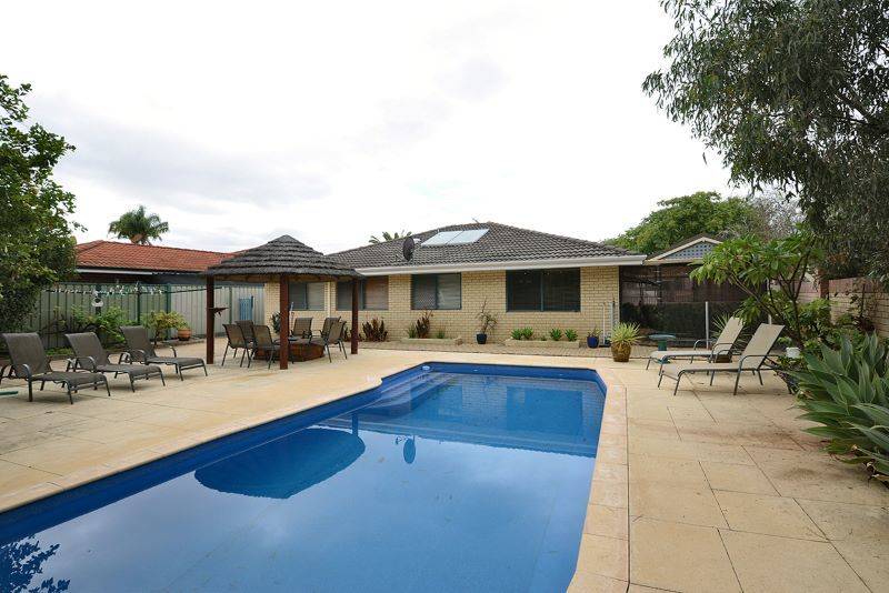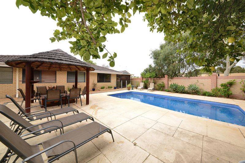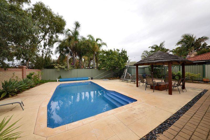 Fully fenced below ground pool with feature limestone paving and separate thatched gazebo entertaining, all overlooking tropical gardens