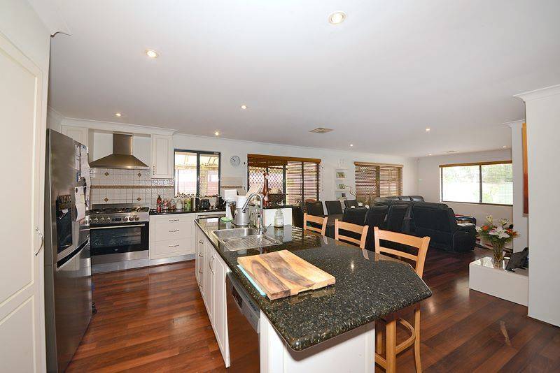 Spacious kitchen with central island bench, stainless steel appliances including 900ml free standing oven and hotplates, dishwasher, rangehood, inbuilt pantry, microwave recess and ample bench and cupboard space