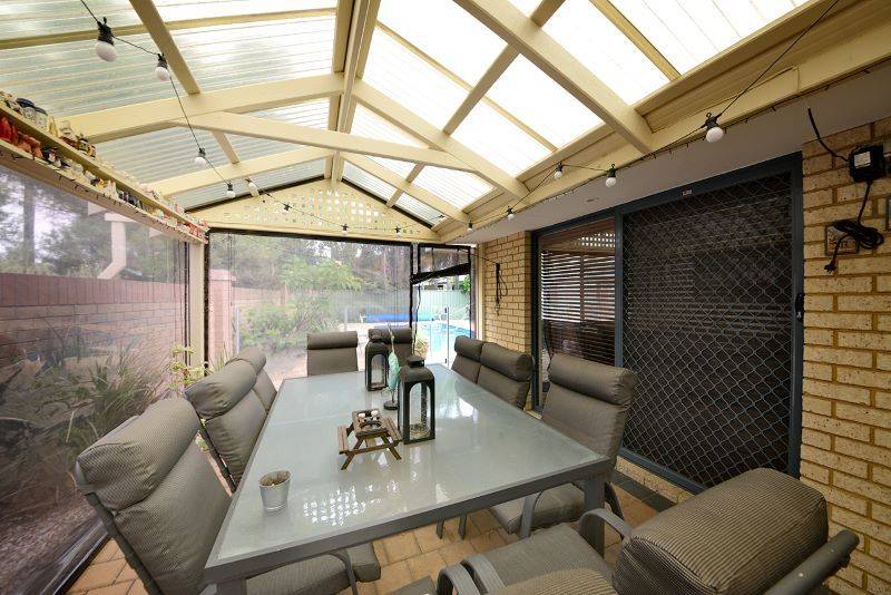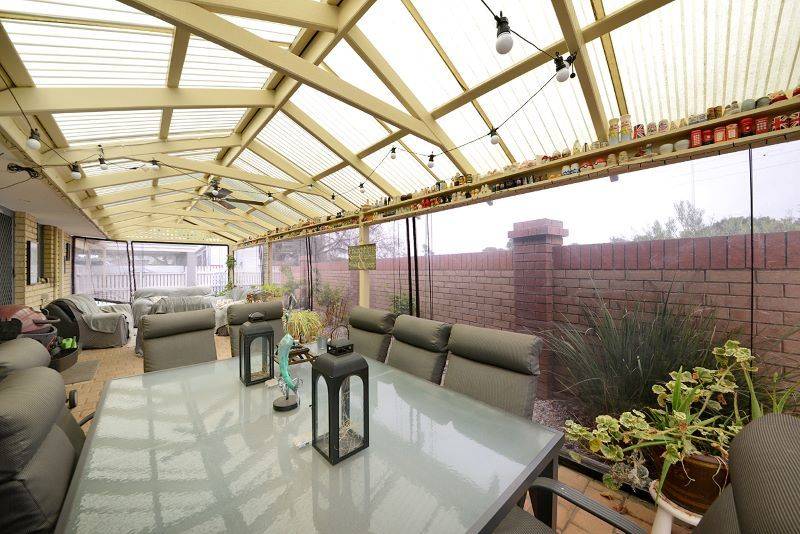Outdoor entertaining area with a pitched patio area (with café blinds)