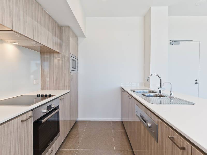 * Open Plan Stainless Steel Kitchen with stone bench tops, glass splash back and dishwasher.