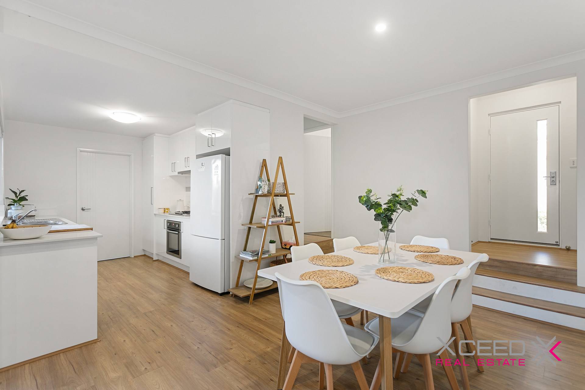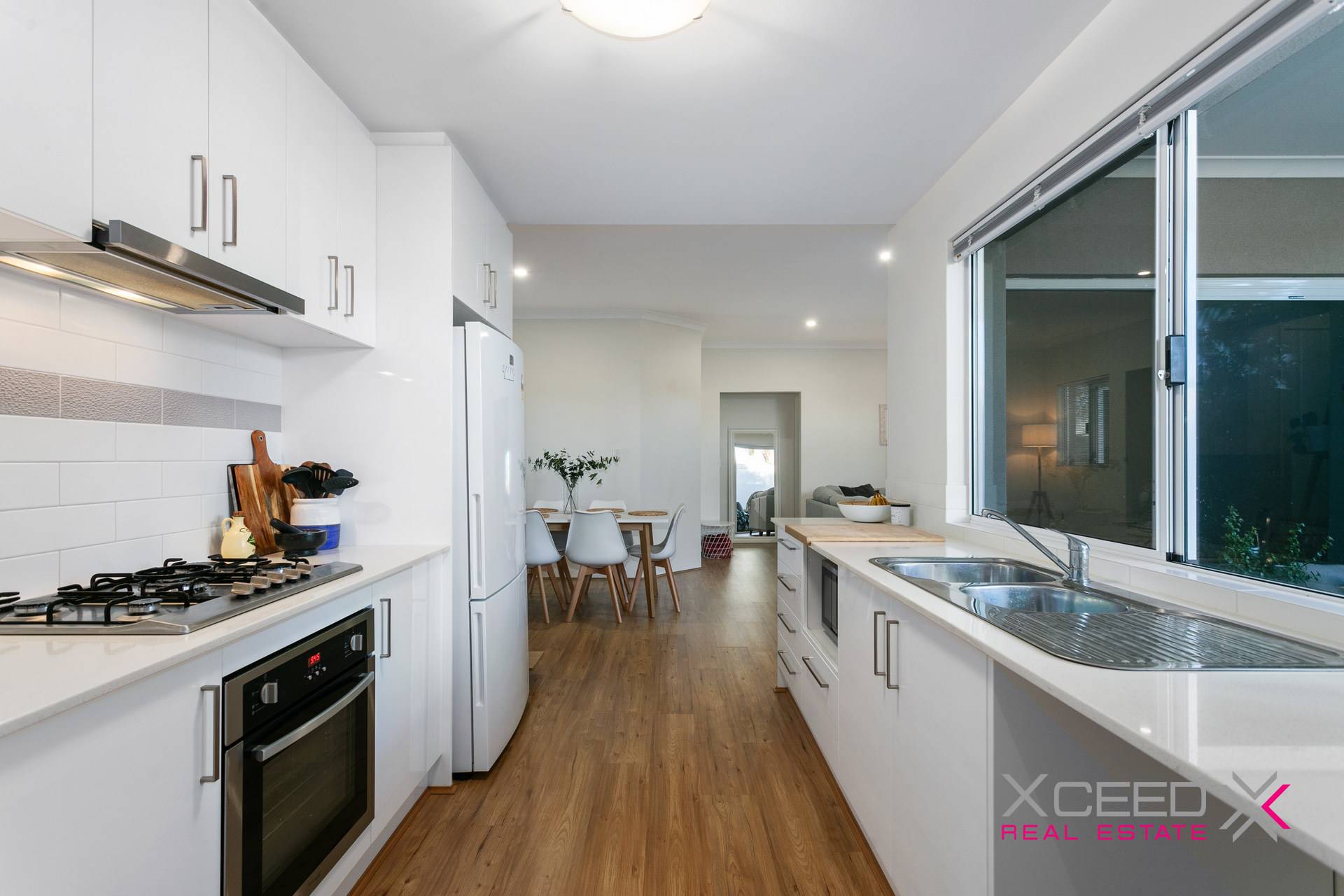 Beyond the welcoming two-tone portico entry, driftwood style laminate flooring flows throughout the hallways and living area, adding a sense of calm and spaciousness to the home. Step down to the open-plan living and dining zone, which incorporates a contemporary, galley-style kitchen - complete with stone benchtops, subway-tiled splashback, ample cabinets and stainless steel appliances.