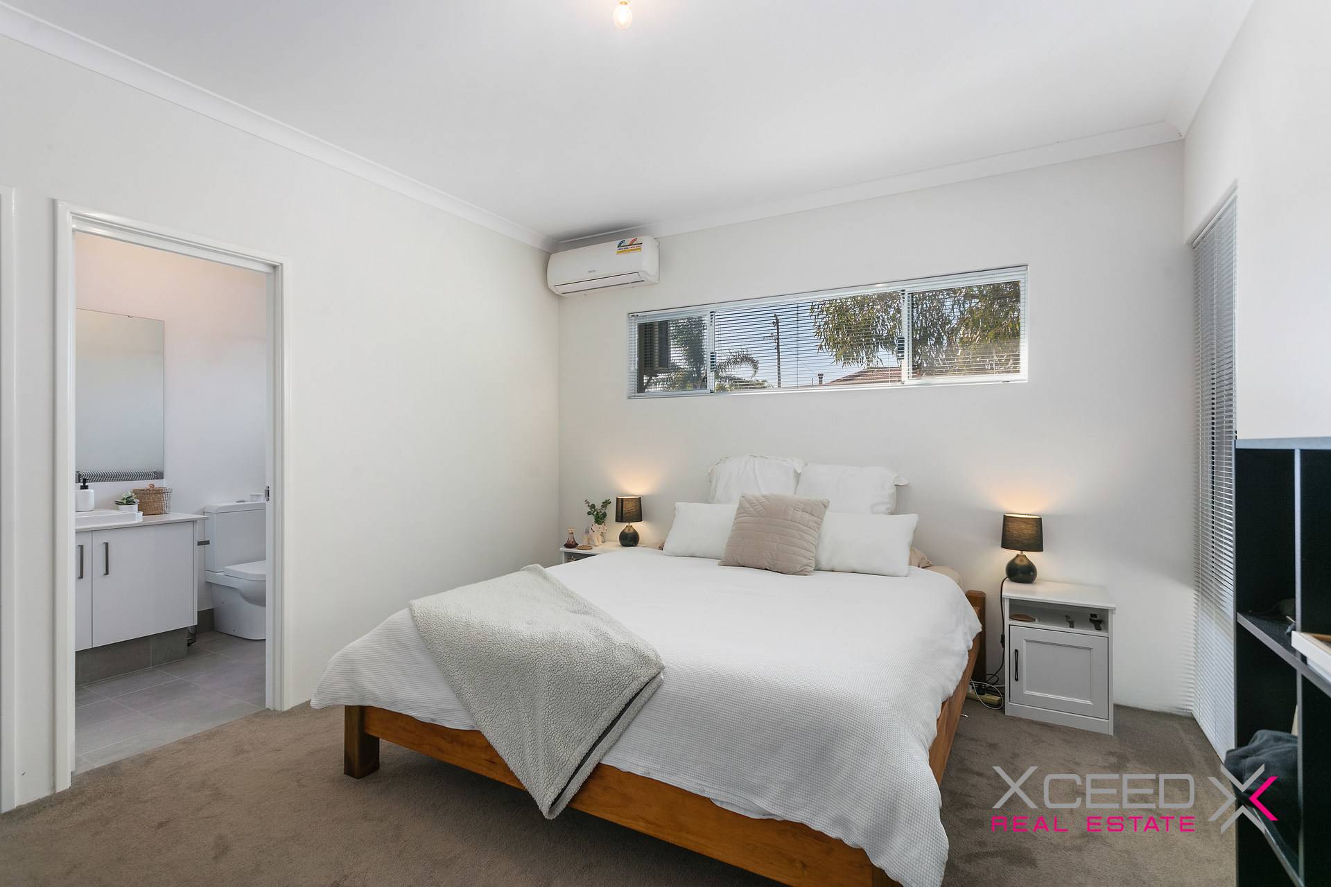The two minor bedrooms can accommodate a double bed and offer built-in double robes and Venetian blinds. In contrast, the queen-sized master bedroom boasts a spacious walk-in robe and an elegant ensuite with a stone-topped vanity and an oversized, semi-frameless shower.