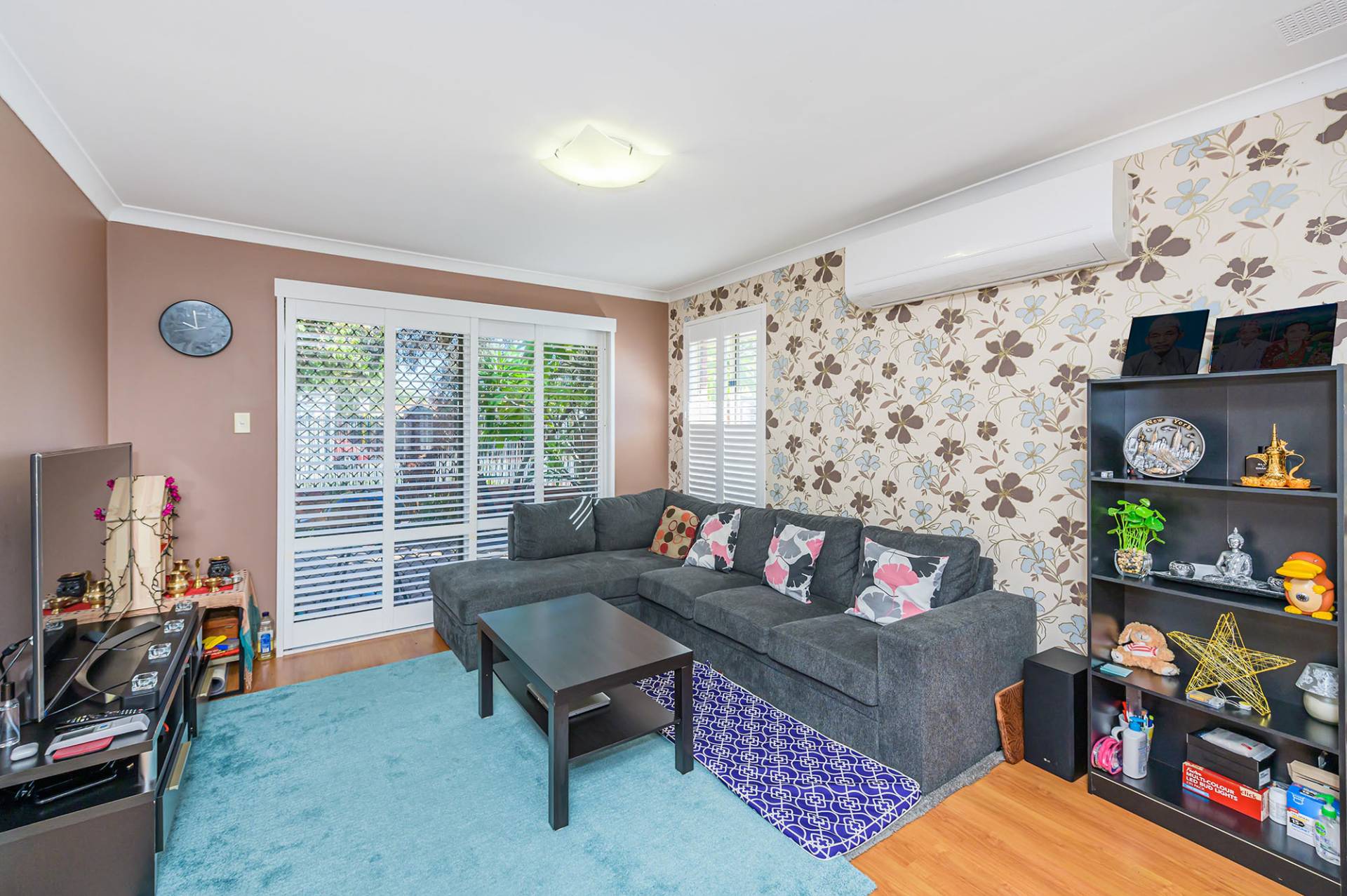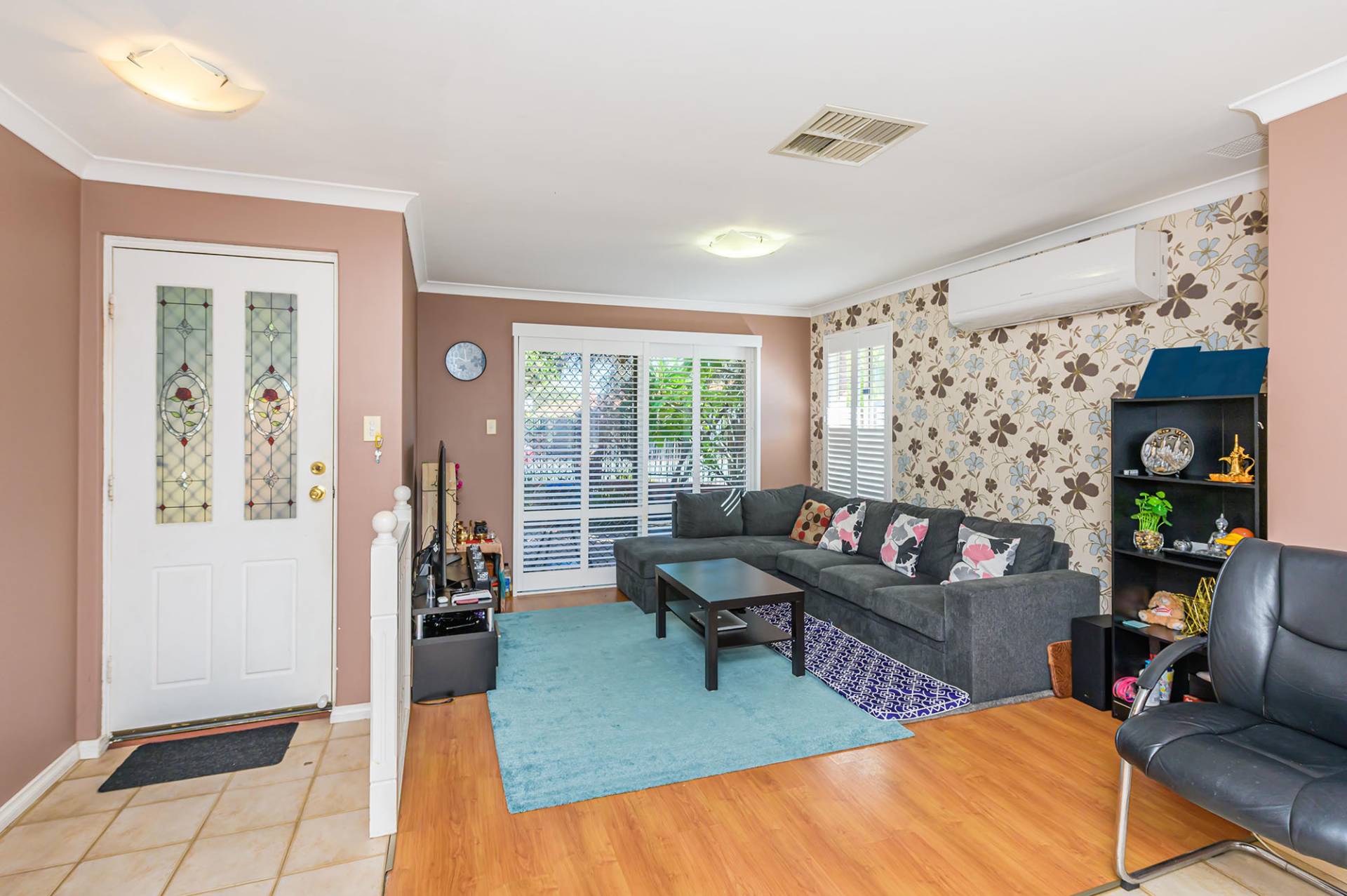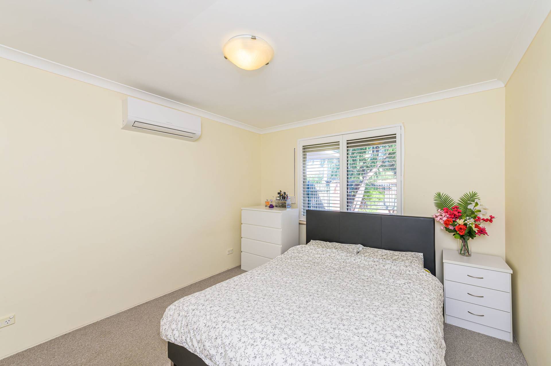 Two minor bedrooms can accommodate double beds, and one has a single built-in robe. The roomy master bedroom has built-in double robes, a split system air conditioner and white shutters.