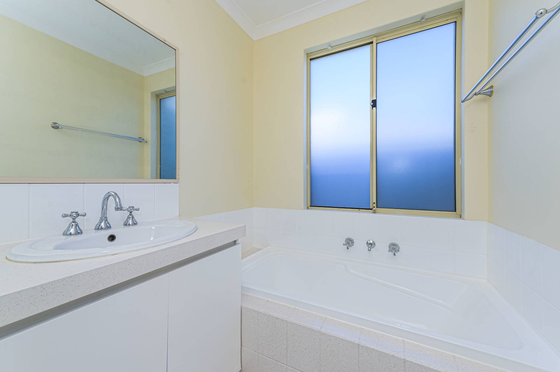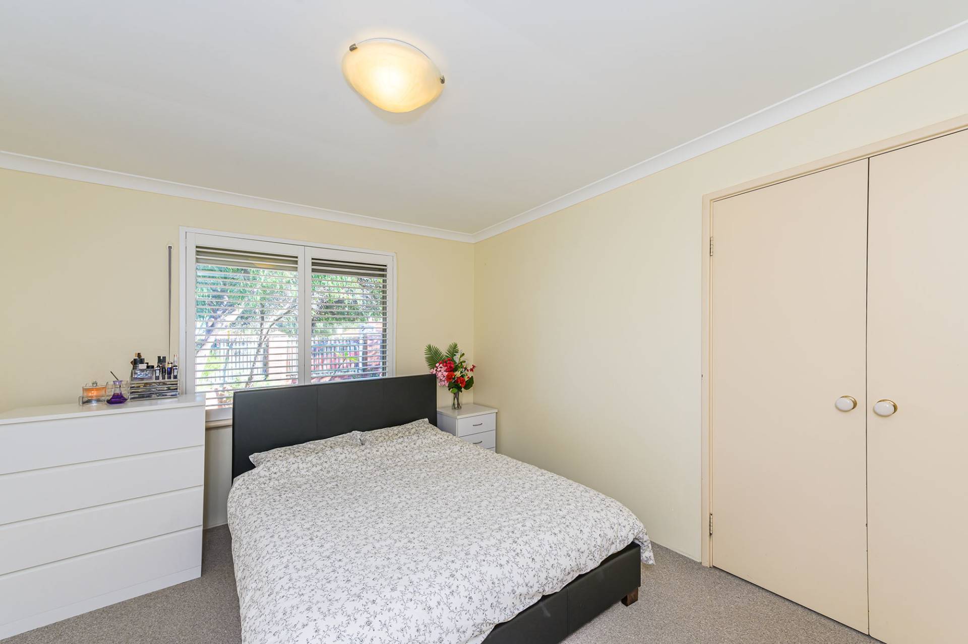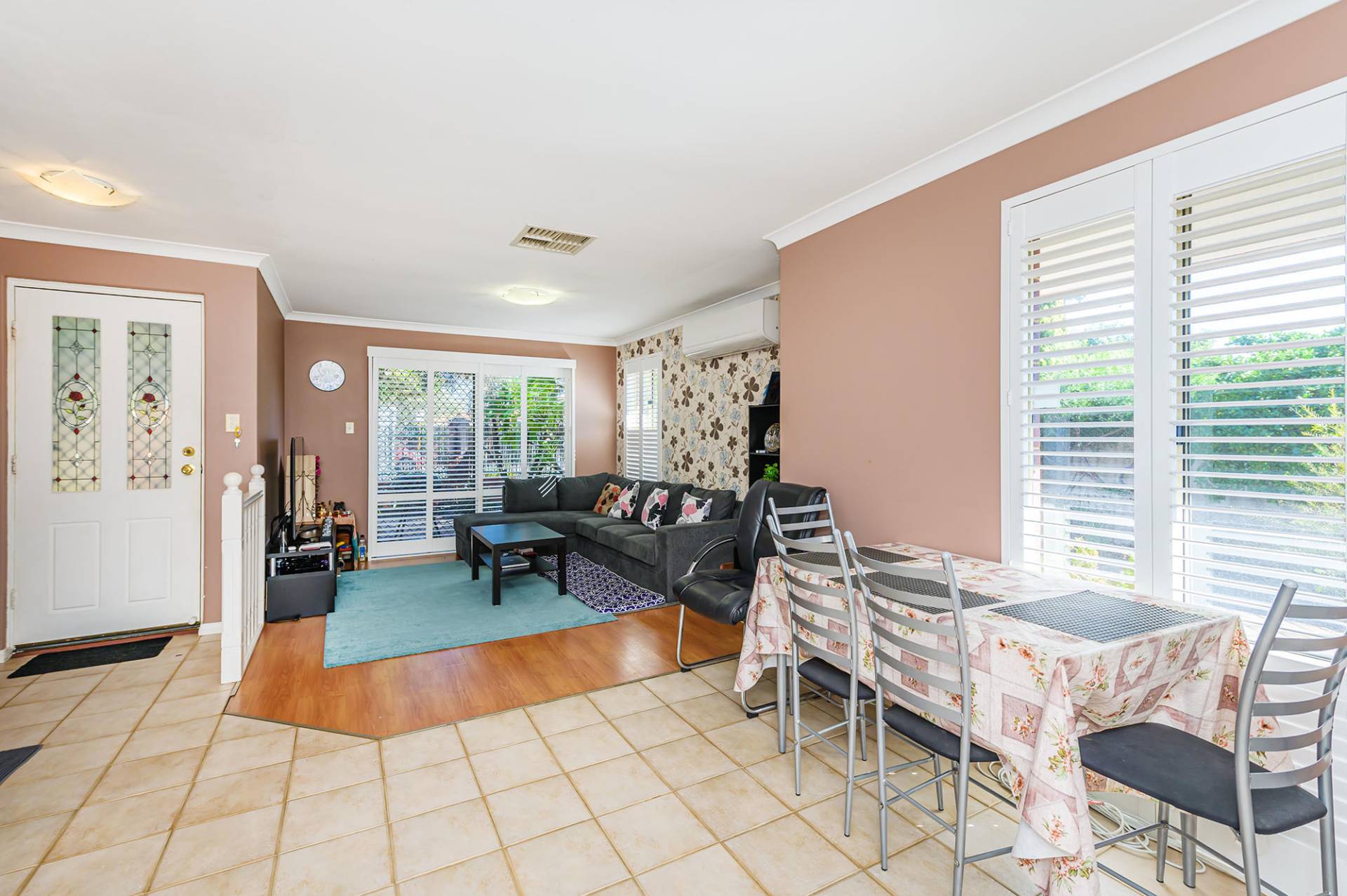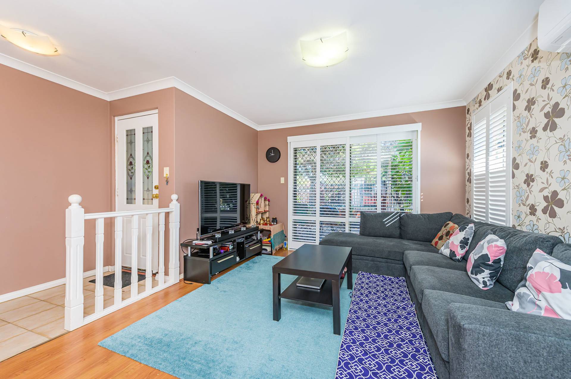 Two minor bedrooms can accommodate double beds, and one has a single built-in robe. The roomy master bedroom has built-in double robes, a split system air conditioner and white shutters.