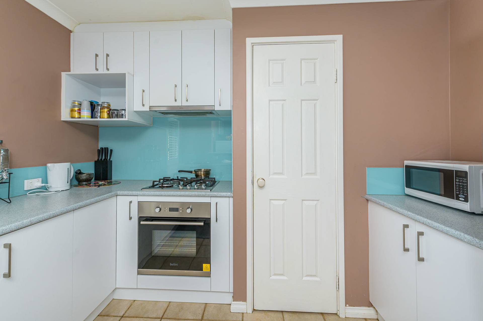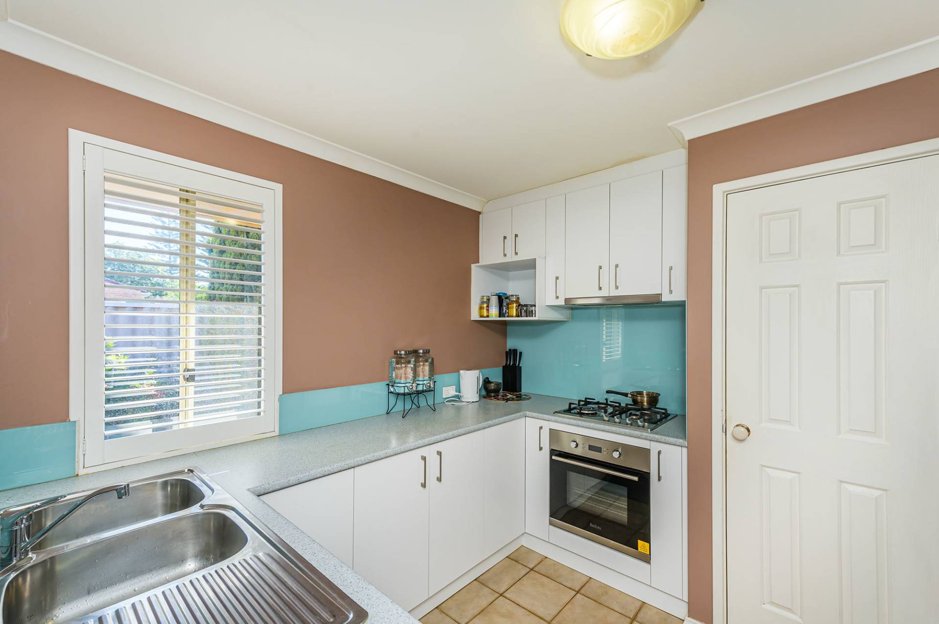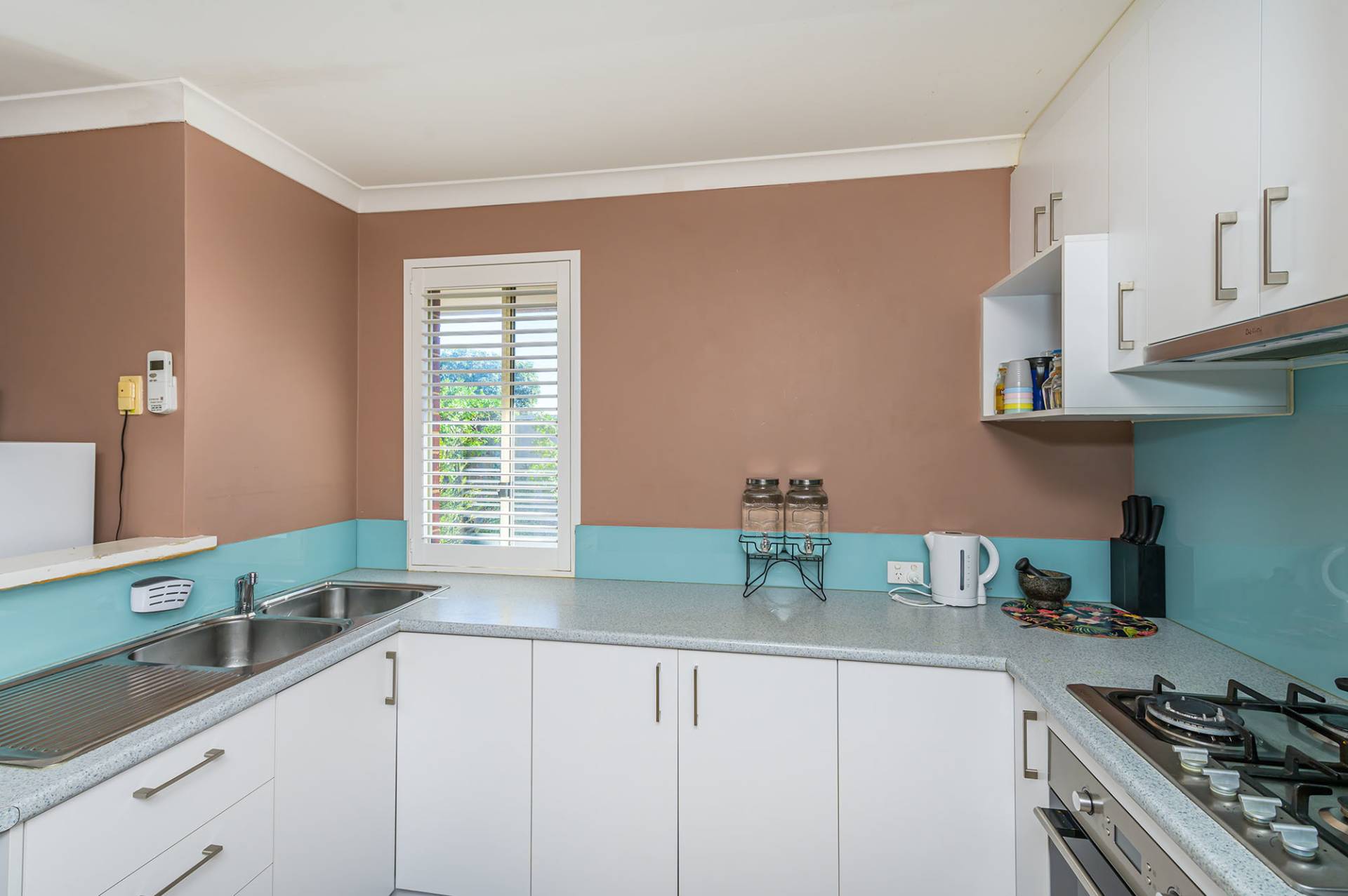 Inside, the open plan living and dining area includes air conditioning and white plantation shutters. Adjacent, the kitchen is well-equipped with stainless steel cooking appliances, a walk-in pantry, plenty of white cabinets and glass splashbacks.