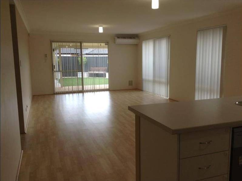 The living area has neutral decor and a split system air conditioner.