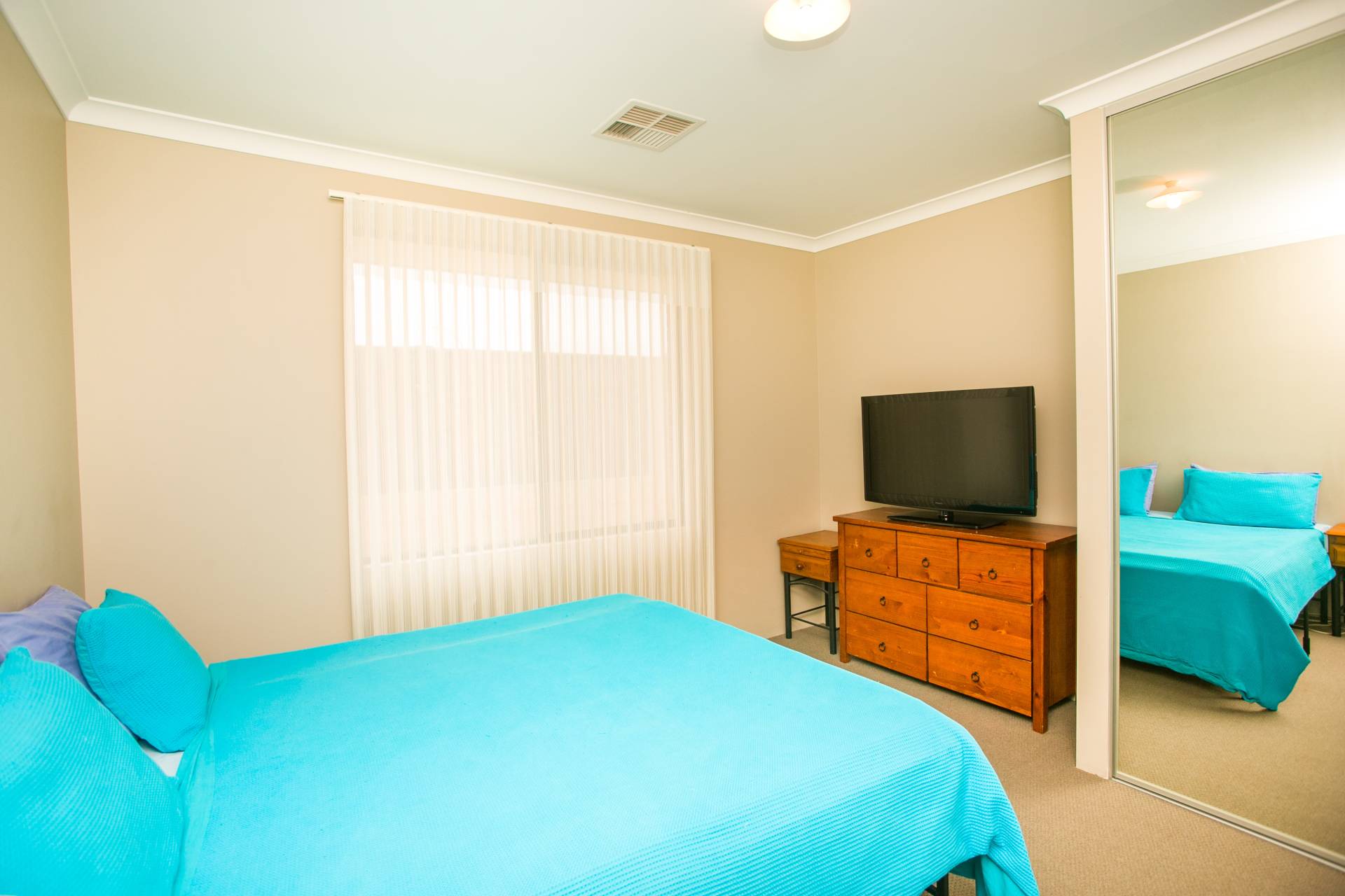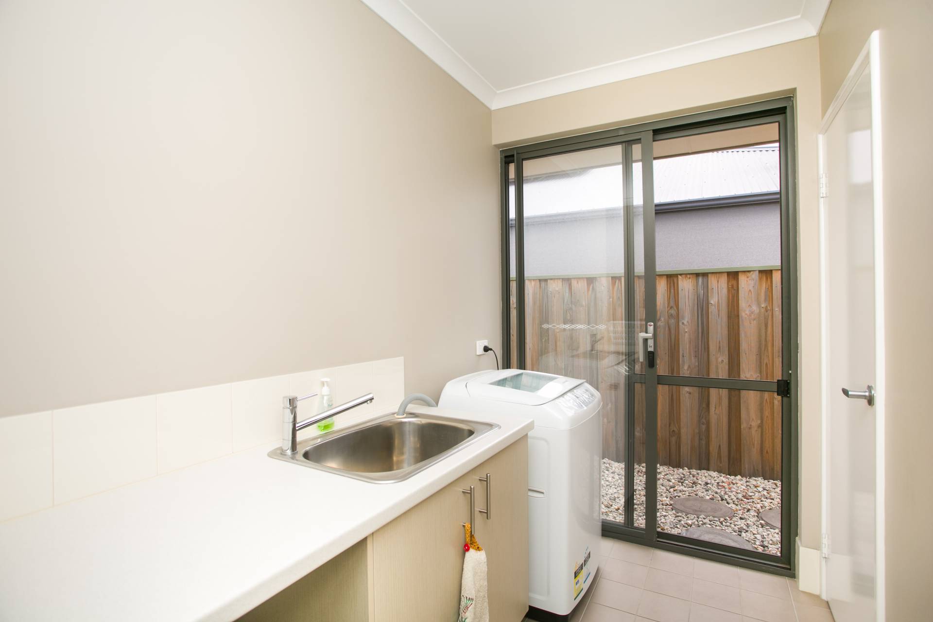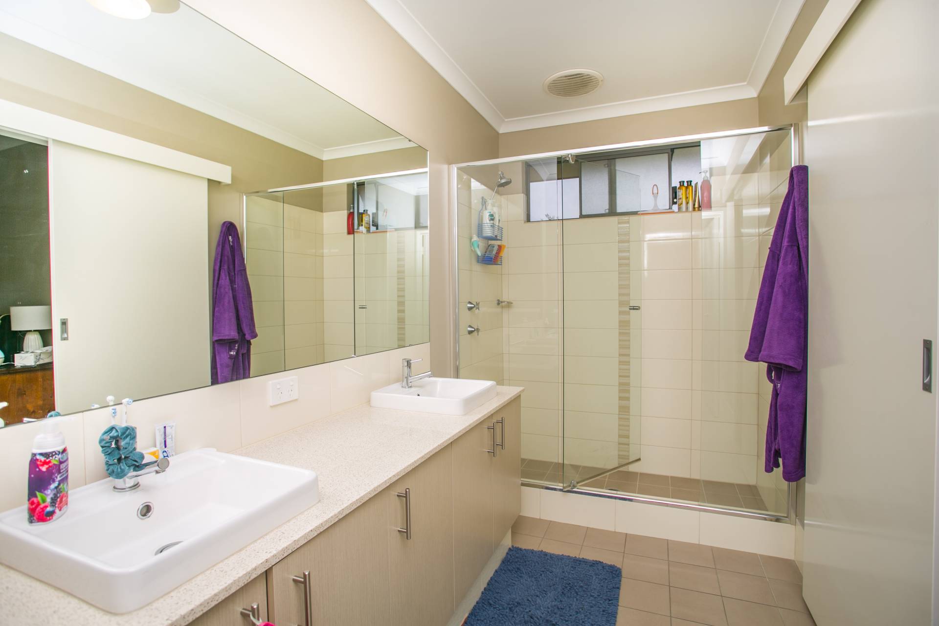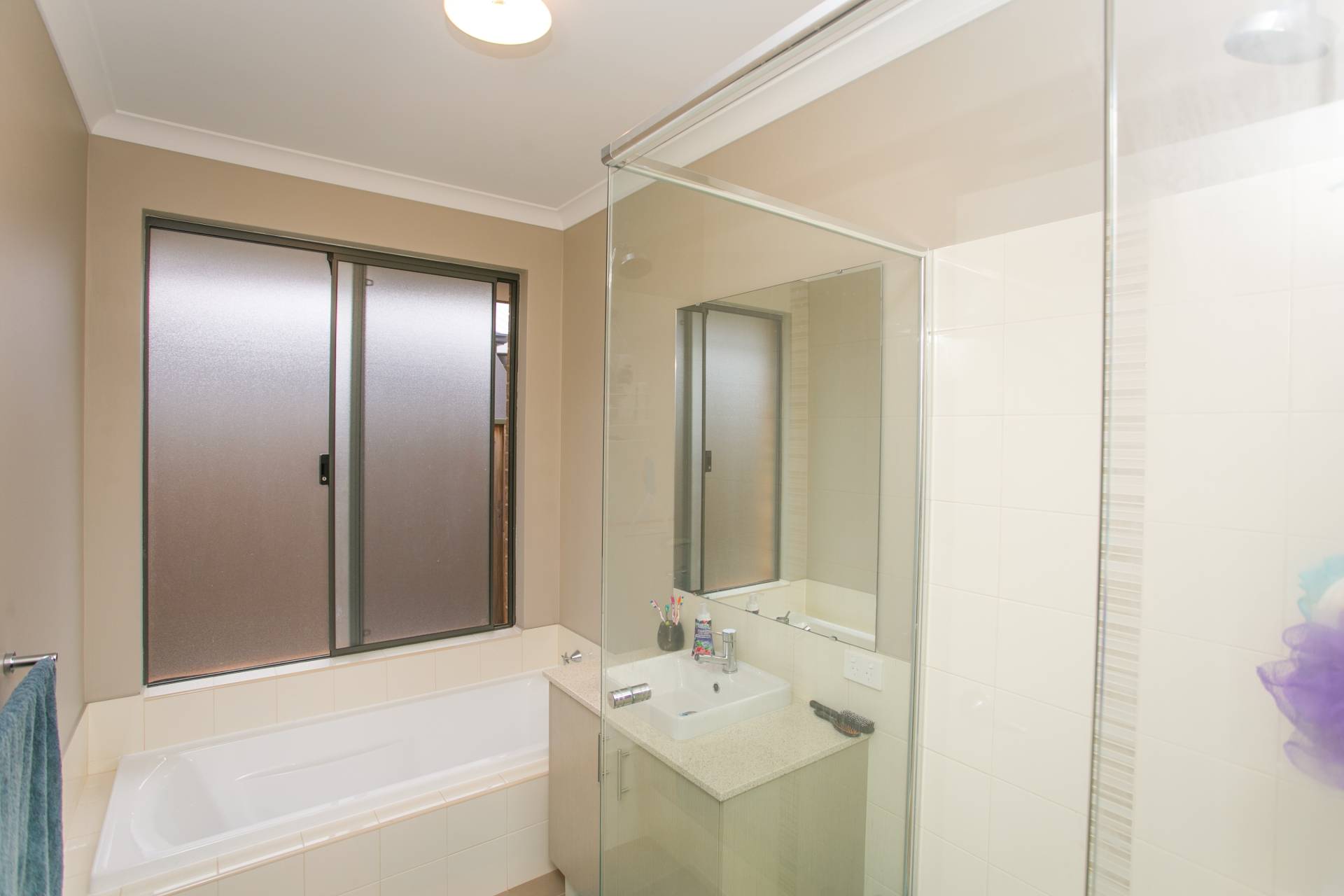 Double mirrored robes feature in each of the minor bedrooms, as well as carpet and semi-sheer white curtains. The minor bedrooms will effortlessly accommodate the kid’s beds and study desks. A bathtub can be found in the family bathroom, with stone benchtop single vanity, semi-raised basin and shower.