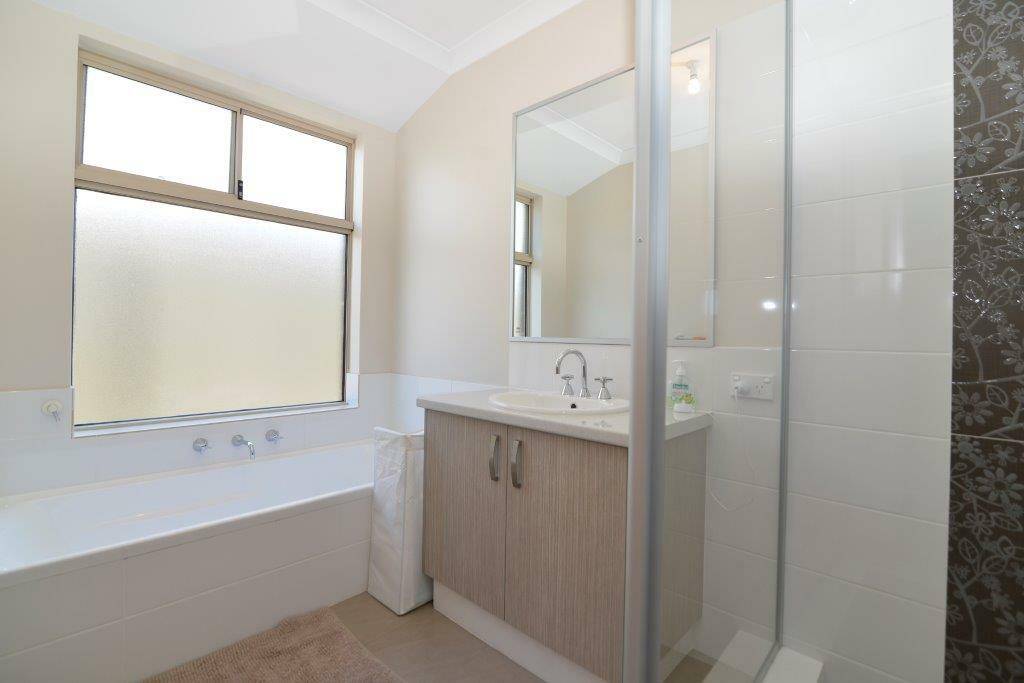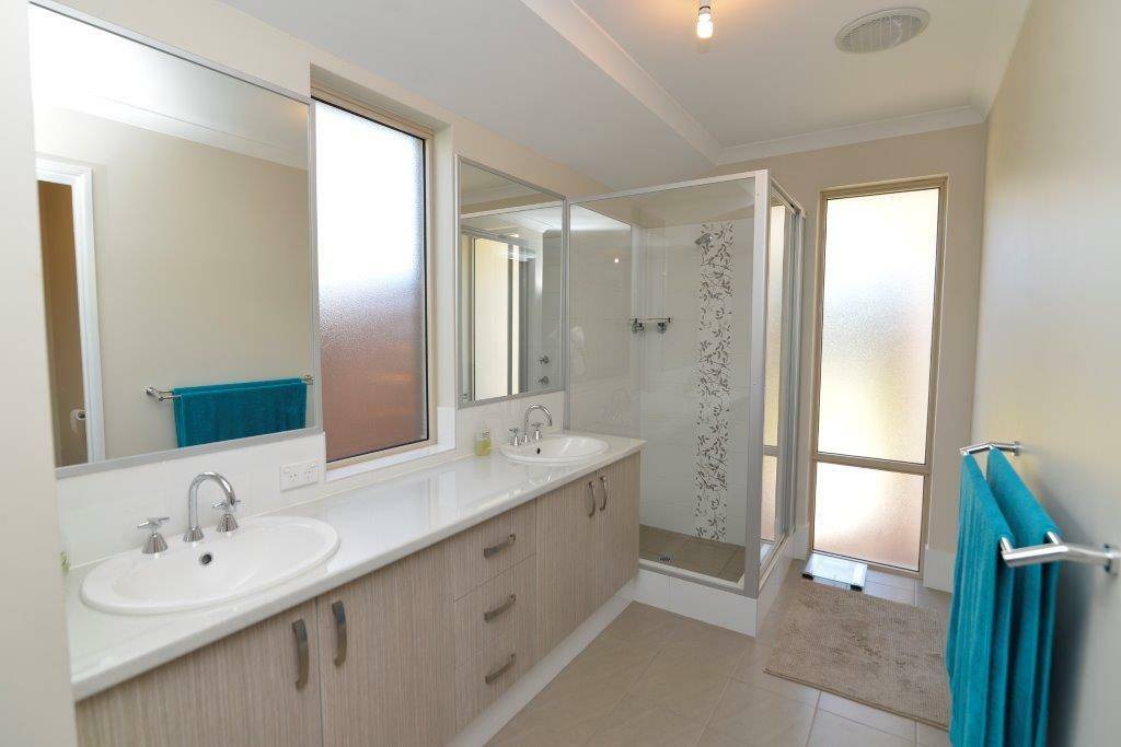 Large ensuite with twin vanities, extra length bench and cupboards, shower with glass screen and separate WC
