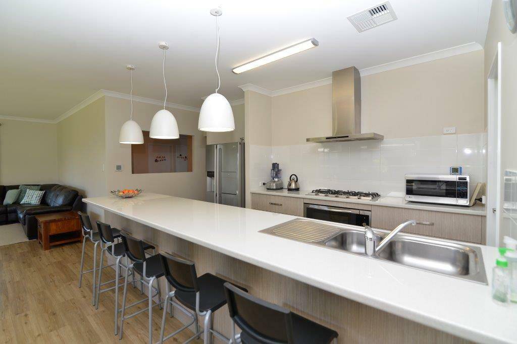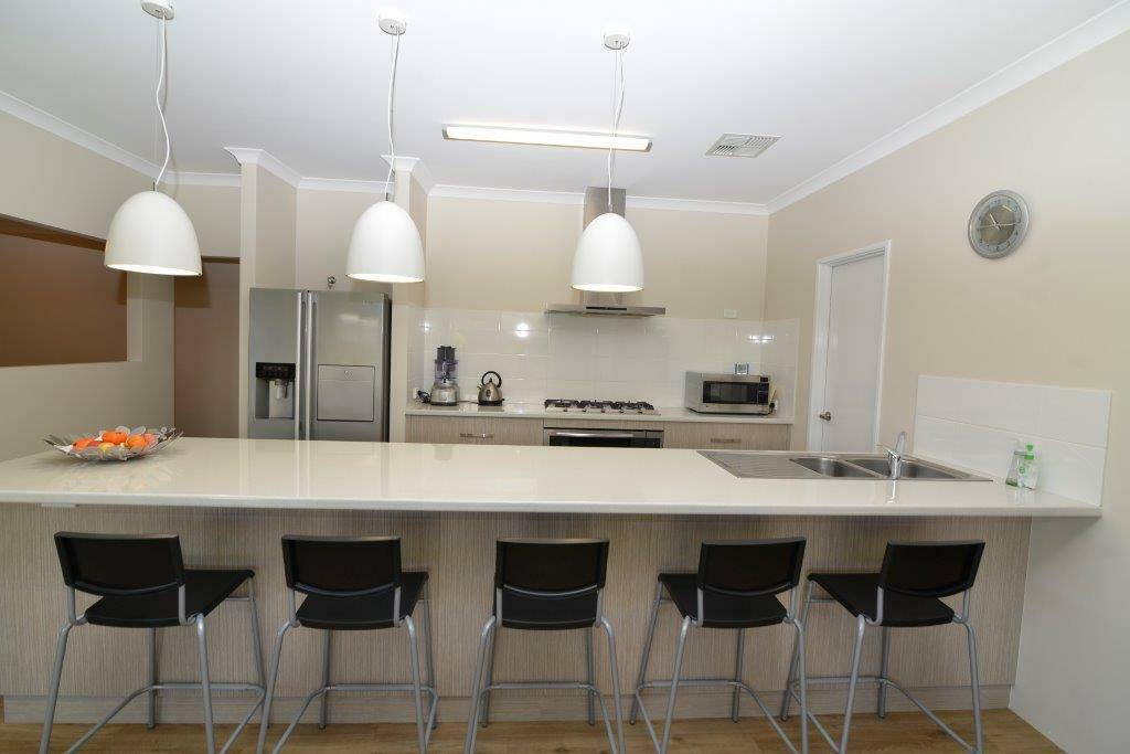 Central kitchen with 5 burner gas hotplate, rangehood, 900ml under bench oven, dishwasher, fridge recess with plumbing, walk in pantry and ample bench and cupboard space
