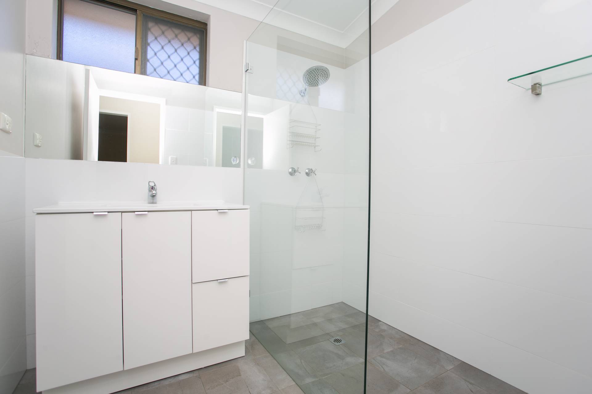 Each of the bedrooms are finished in neutral tones, and include vertical blinds and built-in robes. Both modern bathrooms boast frameless showers, polished tiling and a sleek white vanity and basin.