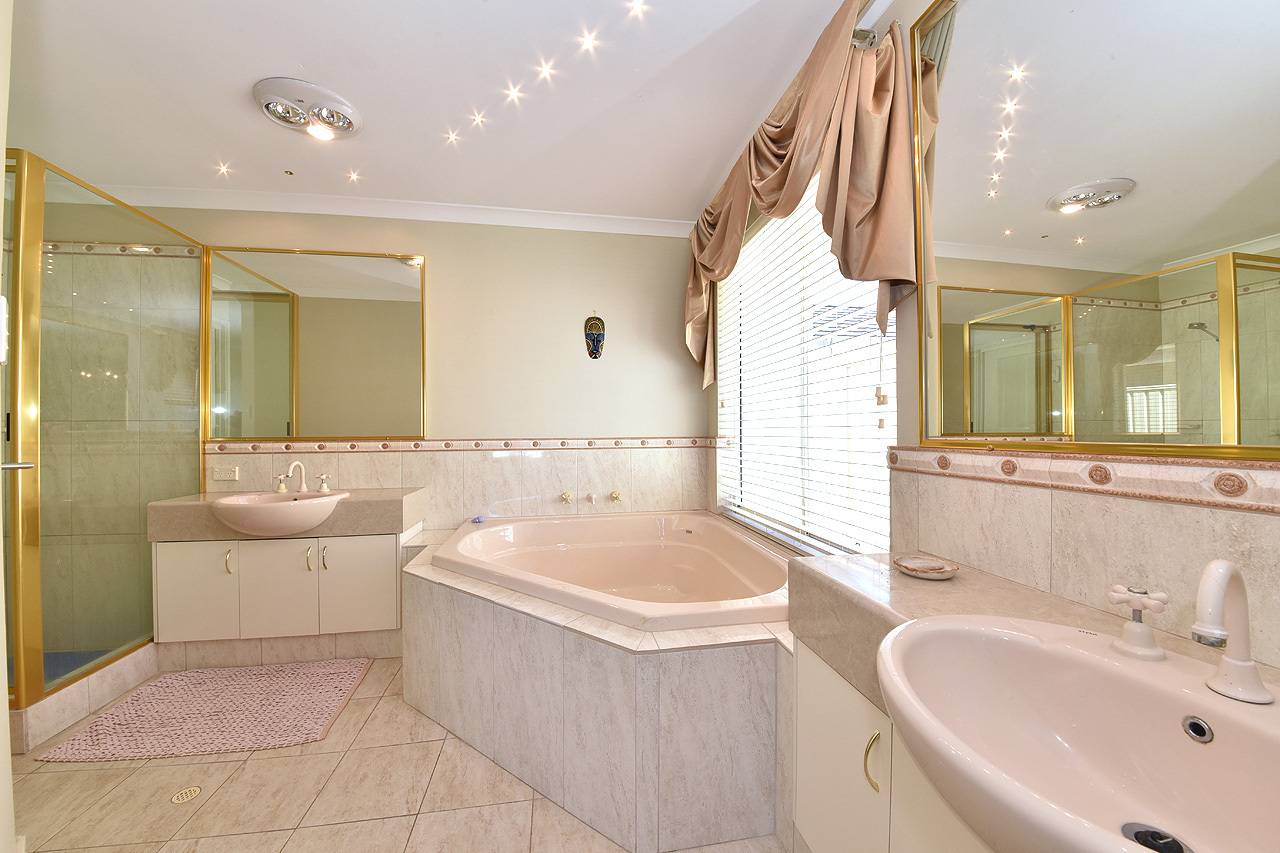 Ensuite with corner bath, shower (with screen), his and her’s vanities, separate toilet and heat lamp