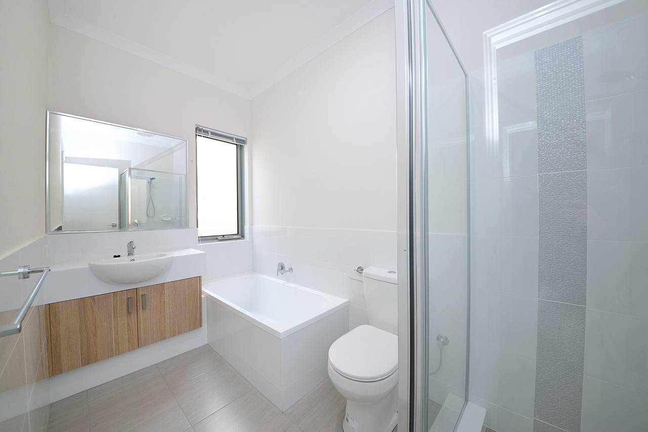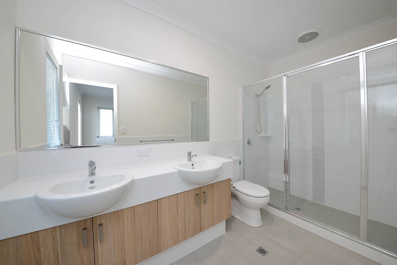 Spacious and modern ensuite with stylish fixtures and fittings, twin vanity and shower with glass screen