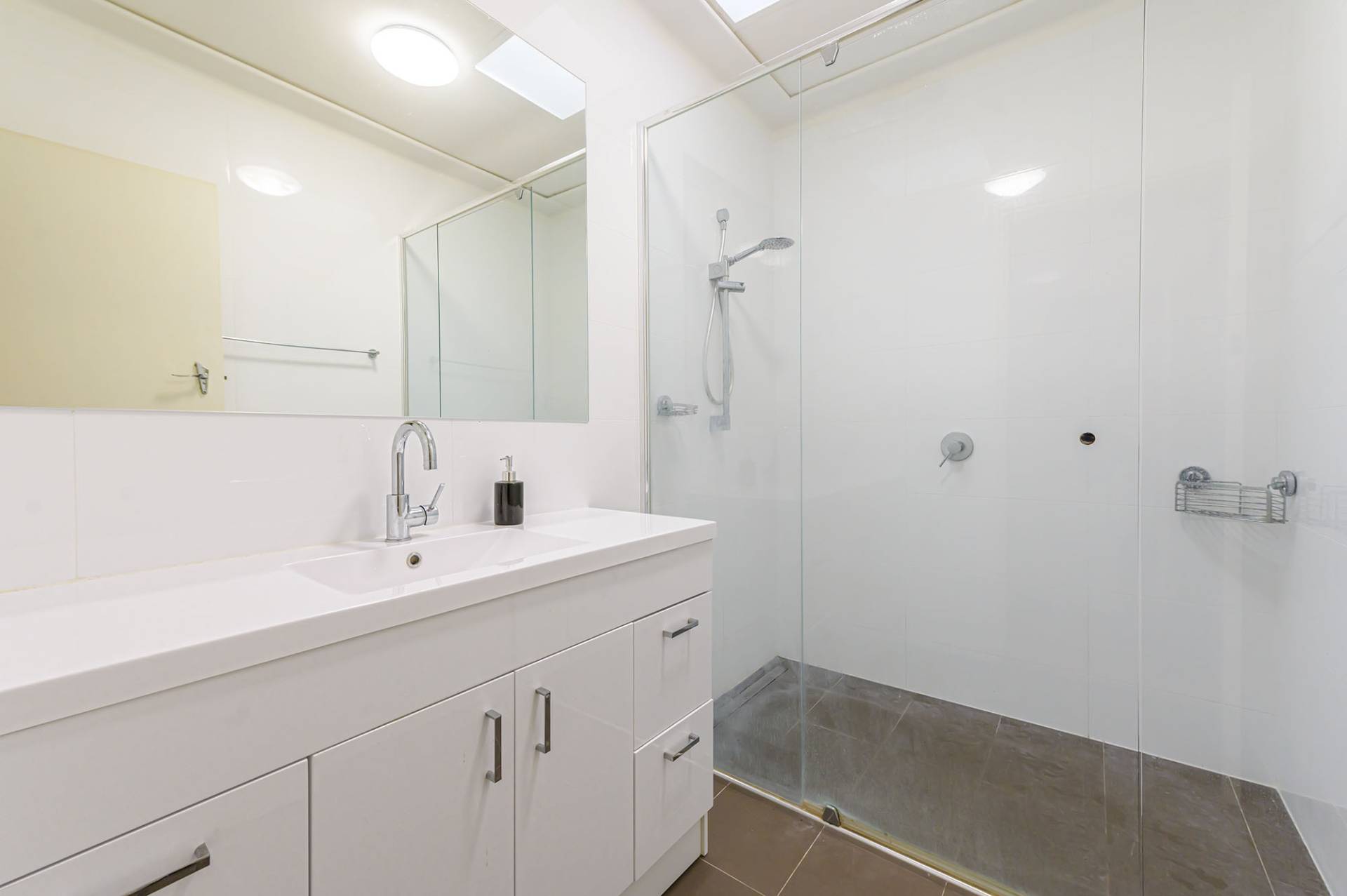 With crisp white tiling, a long vanity and integrated basin, the updated bathroom is elegant and modern. It is complete with a semi-frameless shower, removeable showerhead and cabinetry beneath the vanity.