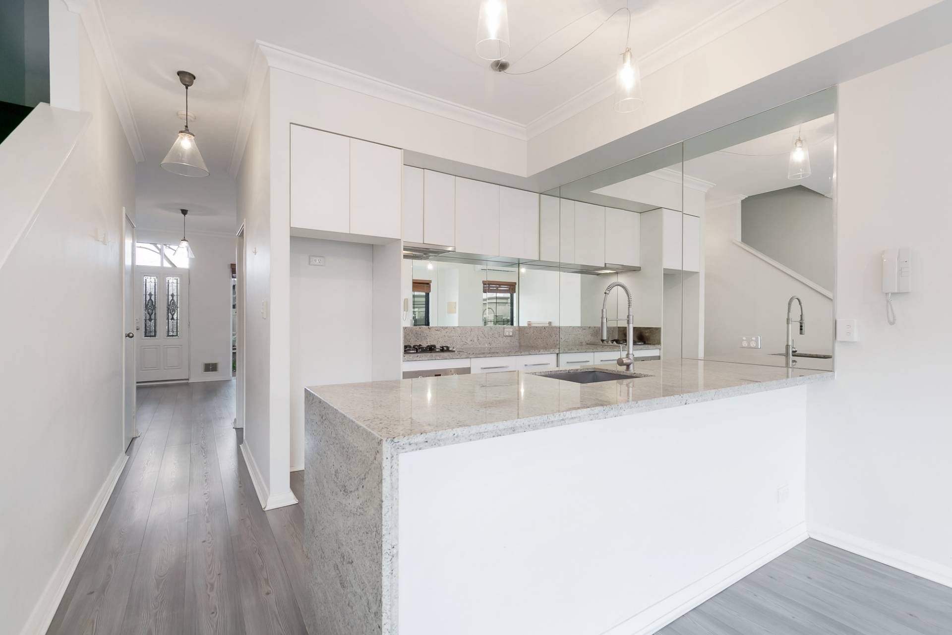 Stone benchtops and a waterfall island bench